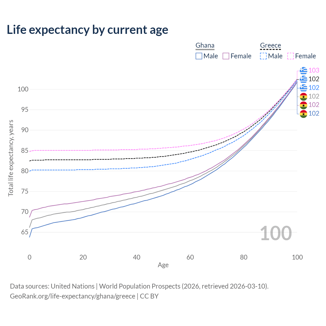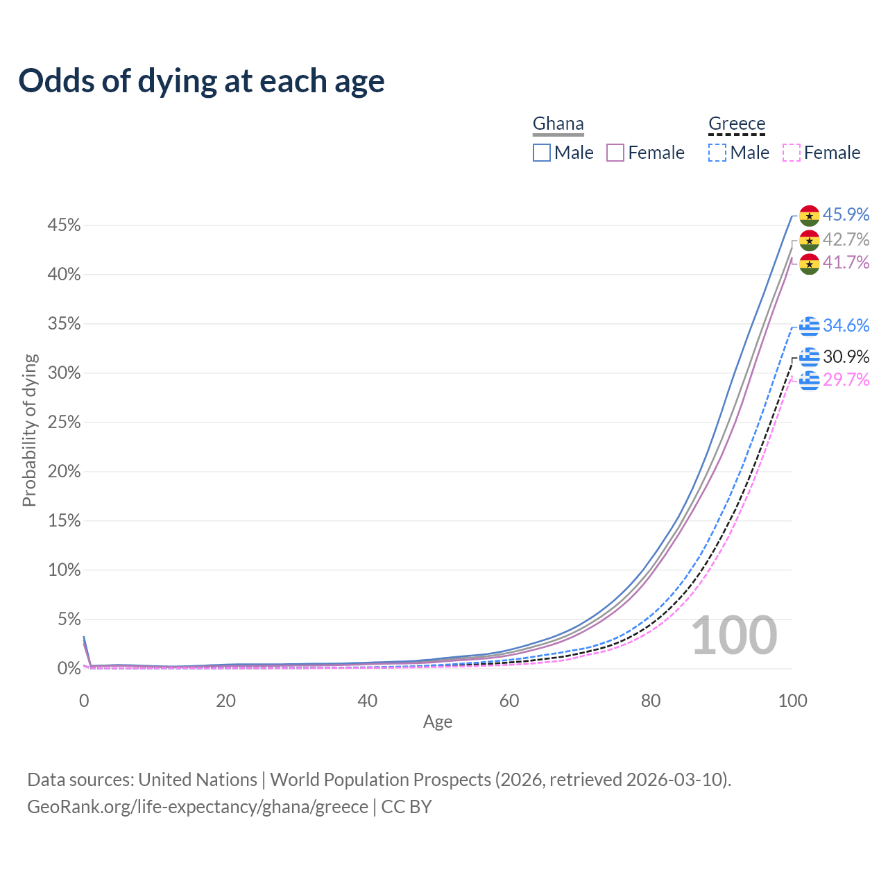 This life expectancy calculator shows the odds of living to 100, 95, 90, and below based on current age for both males and females in Ghana and Greece, along with mean and median age of death. The calculations are based on the 2026 life tables (actuarial tables) from the UN World Population Prospects.