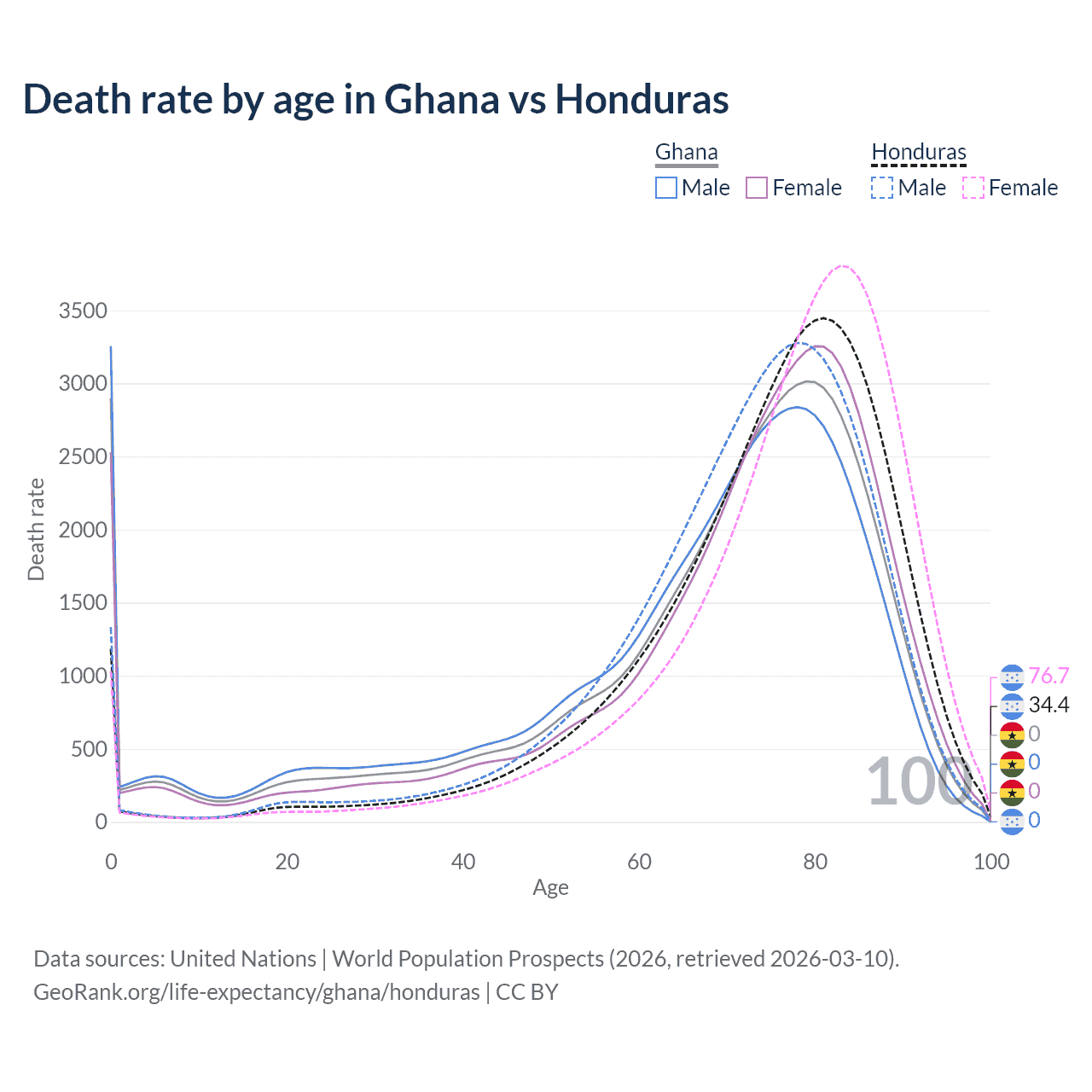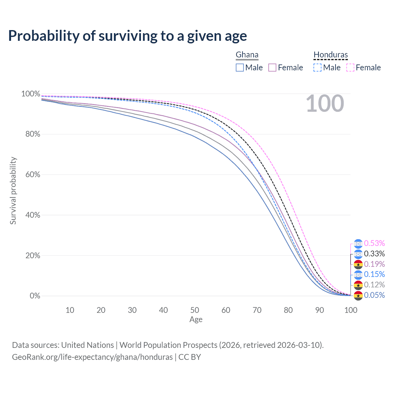 This life expectancy calculator shows the odds of living to 100, 95, 90, and below based on current age for both males and females in Ghana and Honduras, along with mean and median age of death. The calculations are based on the 2026 life tables (actuarial tables) from the UN World Population Prospects.