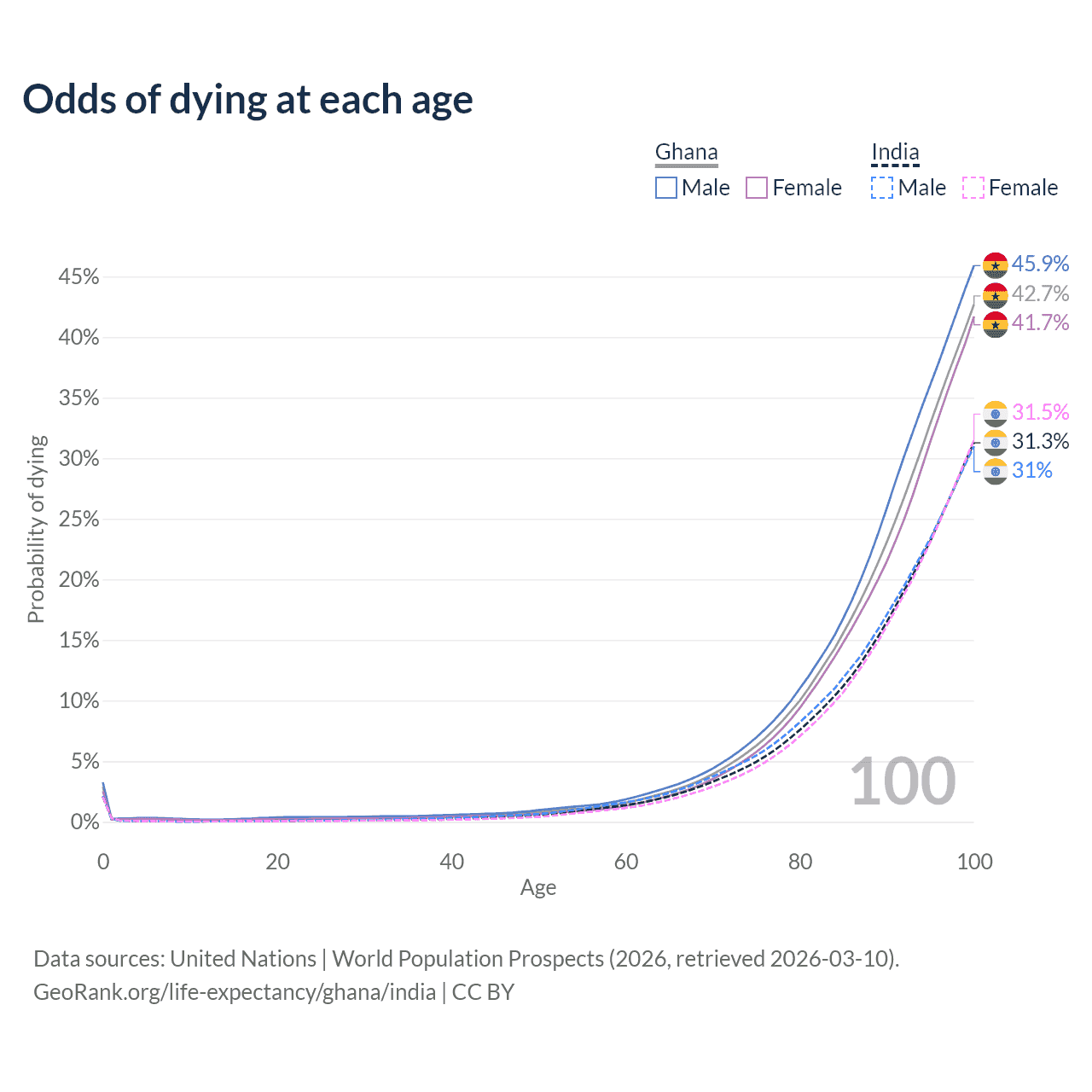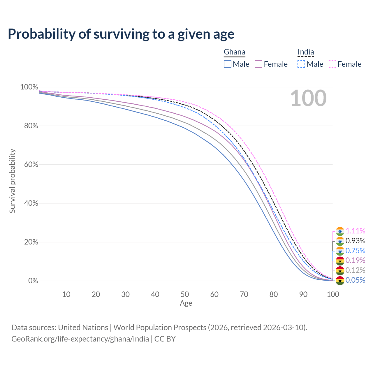 This life expectancy calculator shows the odds of living to 100, 95, 90, and below based on current age for both males and females in Ghana and India, along with mean and median age of death. The calculations are based on the 2026 life tables (actuarial tables) from the UN World Population Prospects.