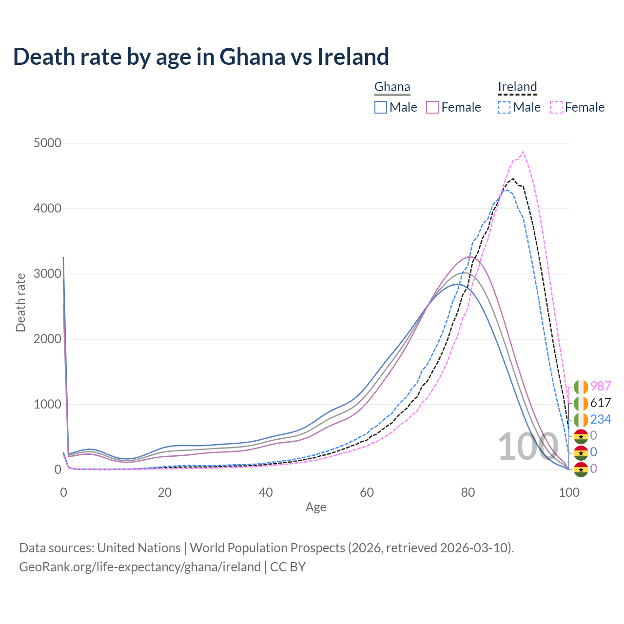 Note that this chart does not show rates per 100,000 population, as those would be skewed by age structure differences and reflect the demographics of Ghana and Ireland more than their death rates.