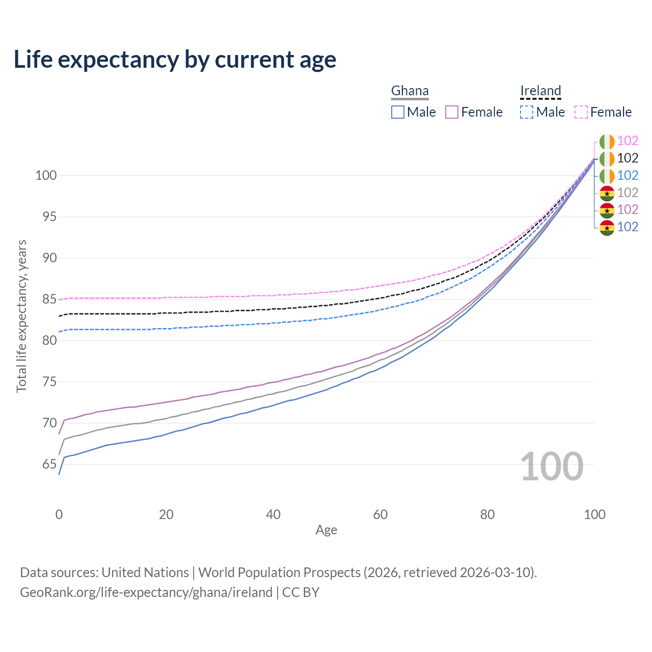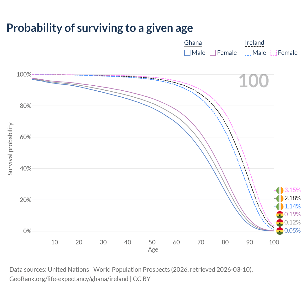 This life expectancy calculator shows the odds of living to 100, 95, 90, and below based on current age for both males and females in Ghana and Ireland, along with mean and median age of death. The calculations are based on the 2026 life tables (actuarial tables) from the UN World Population Prospects.