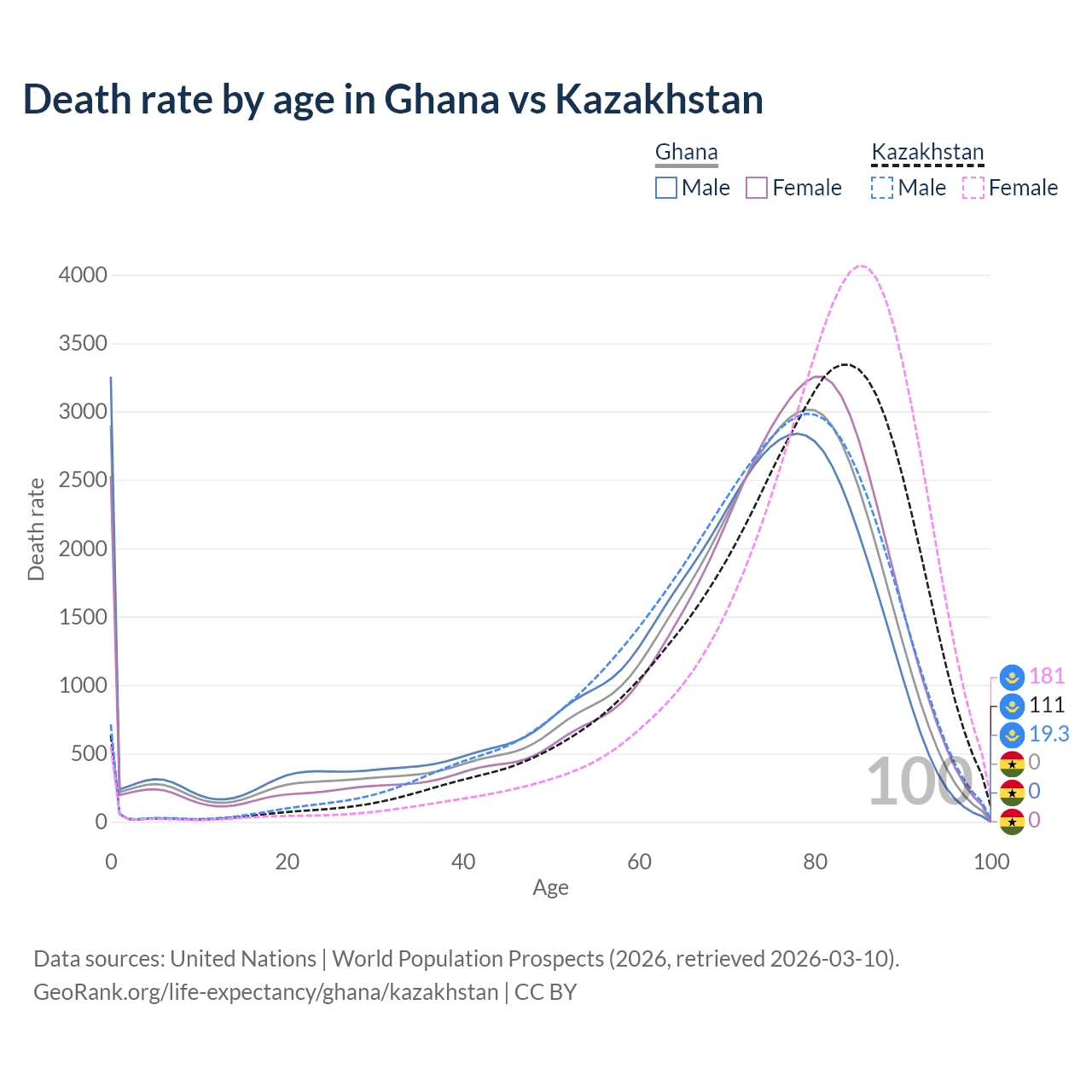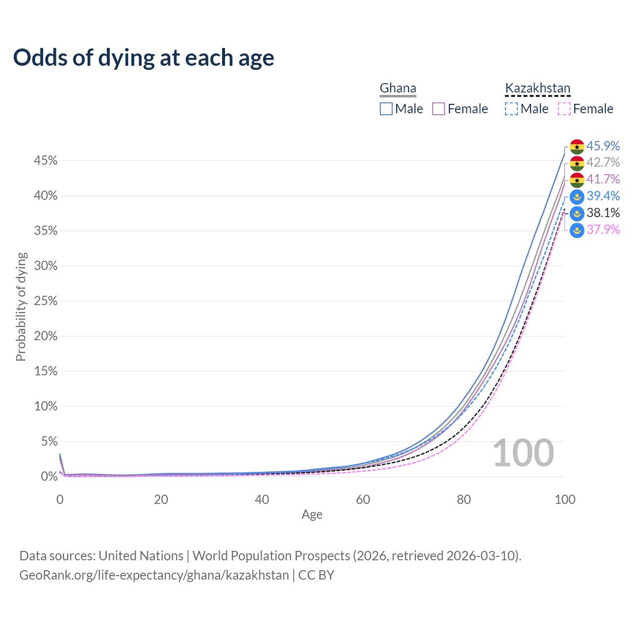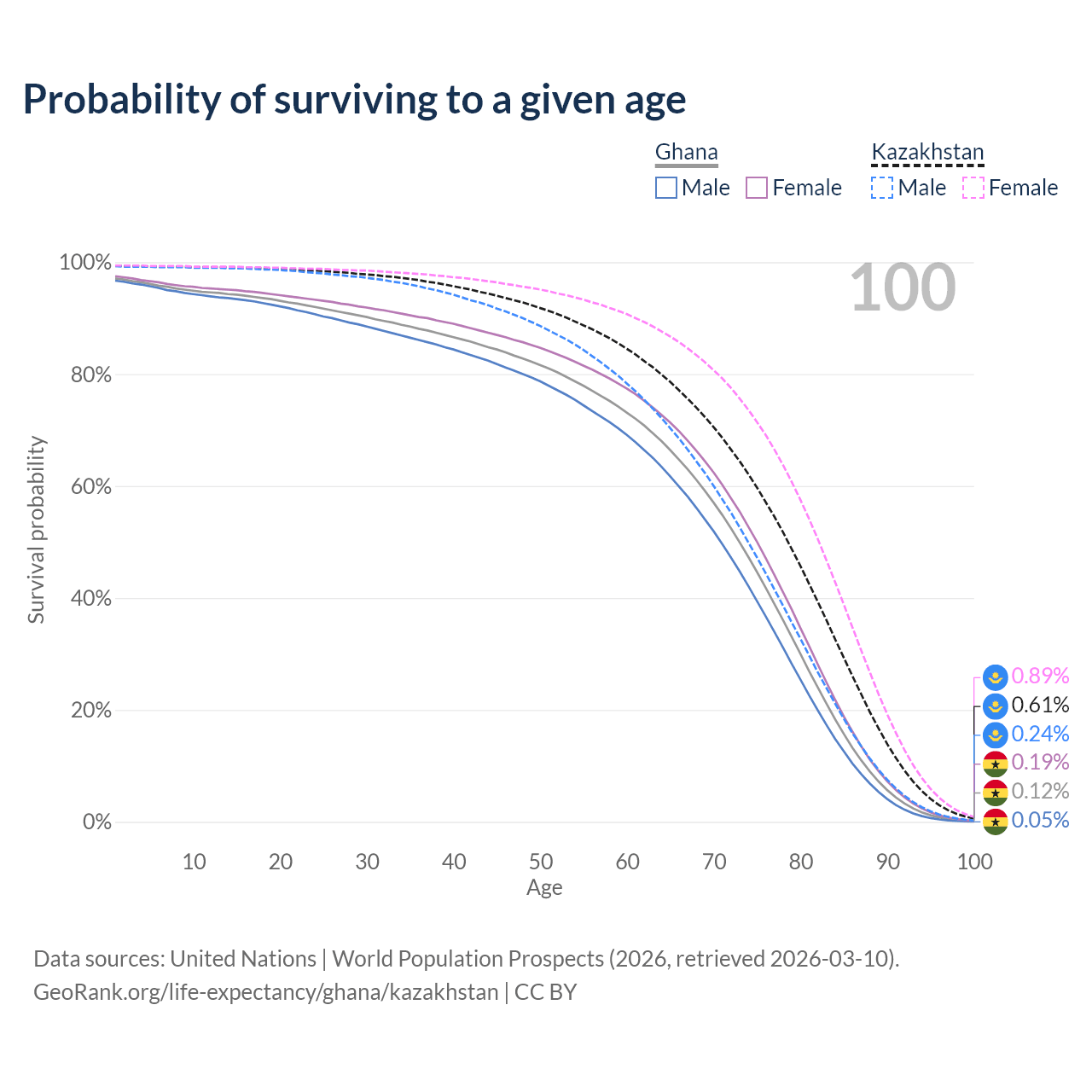 This life expectancy calculator shows the odds of living to 100, 95, 90, and below based on current age for both males and females in Ghana and Kazakhstan, along with mean and median age of death. The calculations are based on the 2026 life tables (actuarial tables) from the UN World Population Prospects.