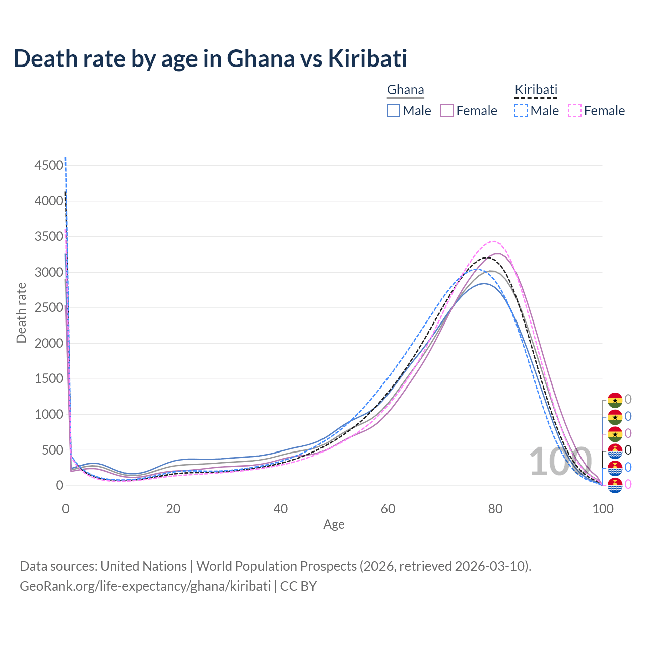 Note that this chart does not show rates per 100,000 population, as those would be skewed by age structure differences and reflect the demographics of Ghana and Kiribati more than their death rates.