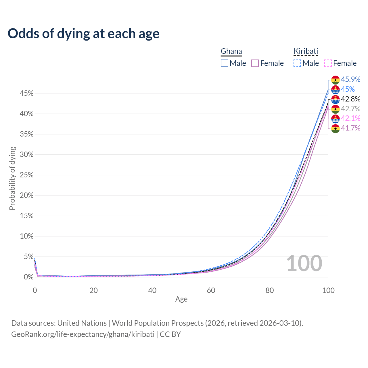 This life expectancy calculator shows the odds of living to 100, 95, 90, and below based on current age for both males and females in Ghana and Kiribati, along with mean and median age of death. The calculations are based on the 2026 life tables (actuarial tables) from the UN World Population Prospects.