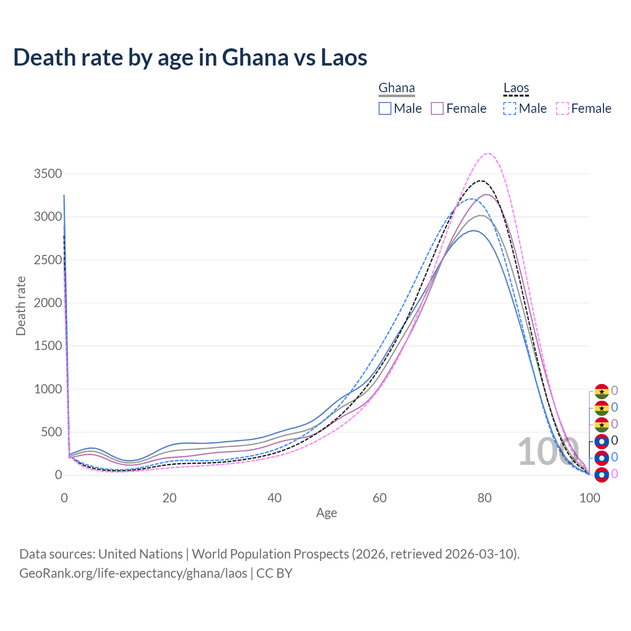 In Ghana, the most common age of death is 79, compared to 79 in Laos. The median age of death is 73 in Ghana and 74.7 in Laos, meaning only half of each cohort is expected to live past that age.