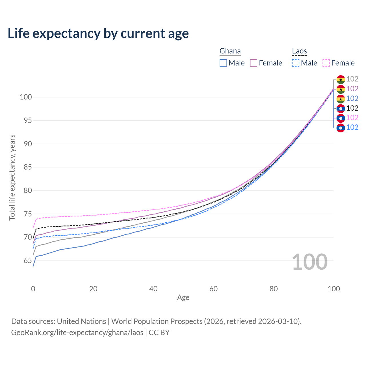 The average life expectancy at birth is 66.1 years in Ghana vs 69.7 in Laos. Ghana is ranked 169/197 by life expectancy, and Laos is 139/197. In Ghana, the life expectancy is 63.7 years for males and 68.6 years for females. In Laos, it's 67.5 years for males and 72 years for females.