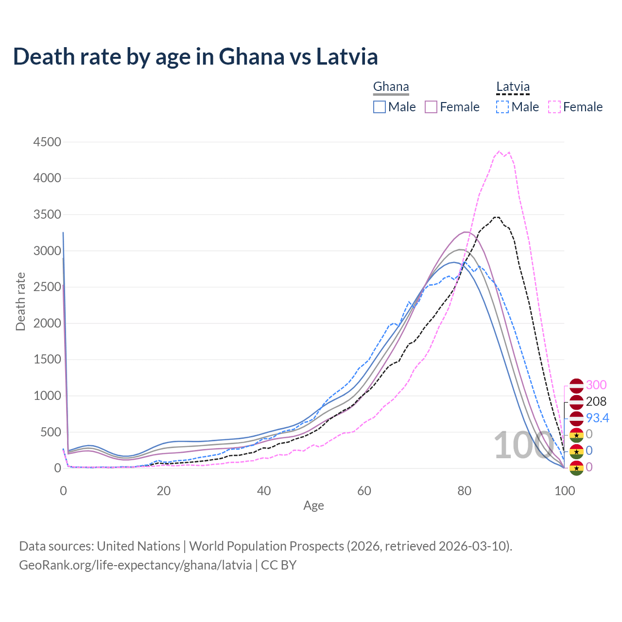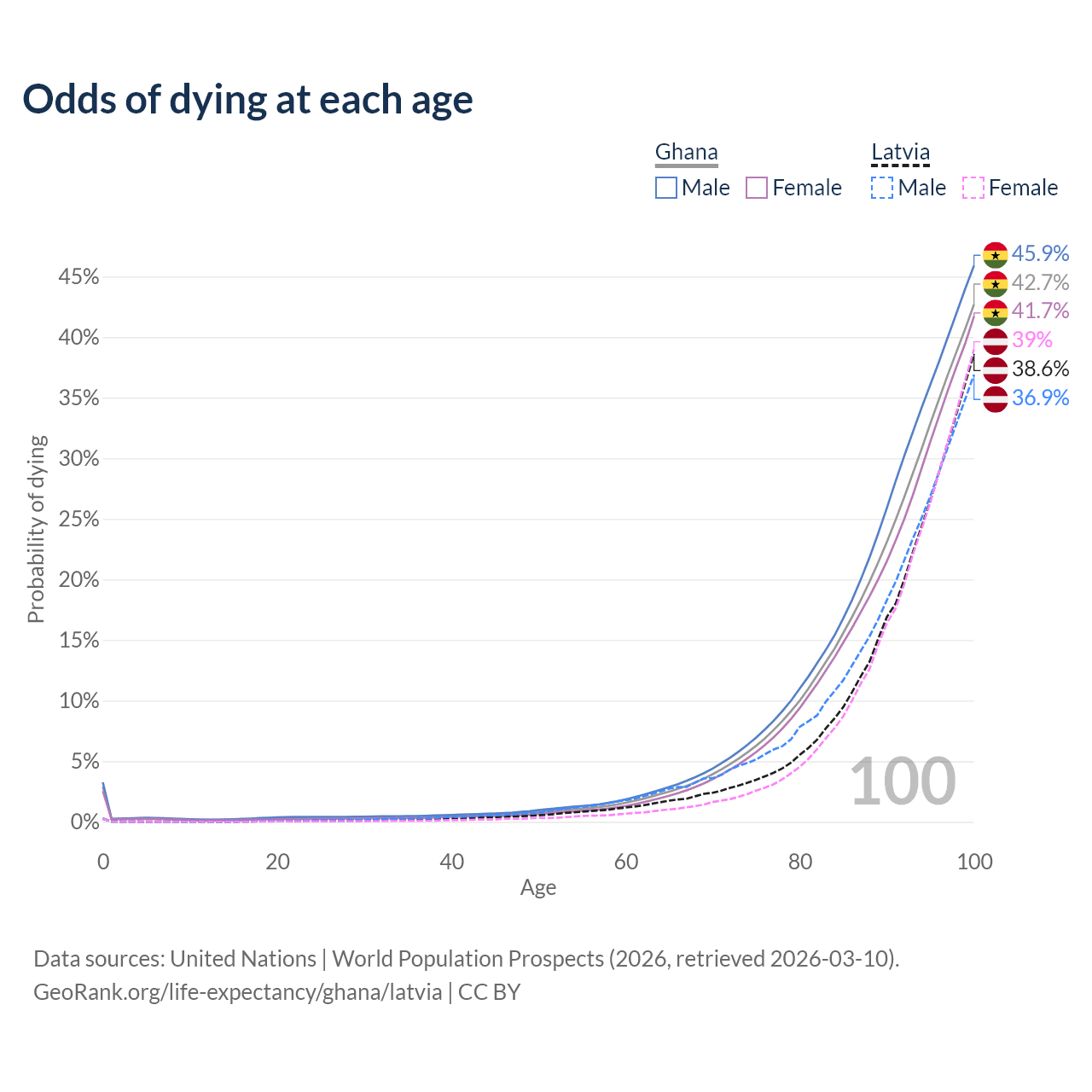 This life expectancy calculator shows the odds of living to 100, 95, 90, and below based on current age for both males and females in Ghana and Latvia, along with mean and median age of death. The calculations are based on the 2026 life tables (actuarial tables) from the UN World Population Prospects.