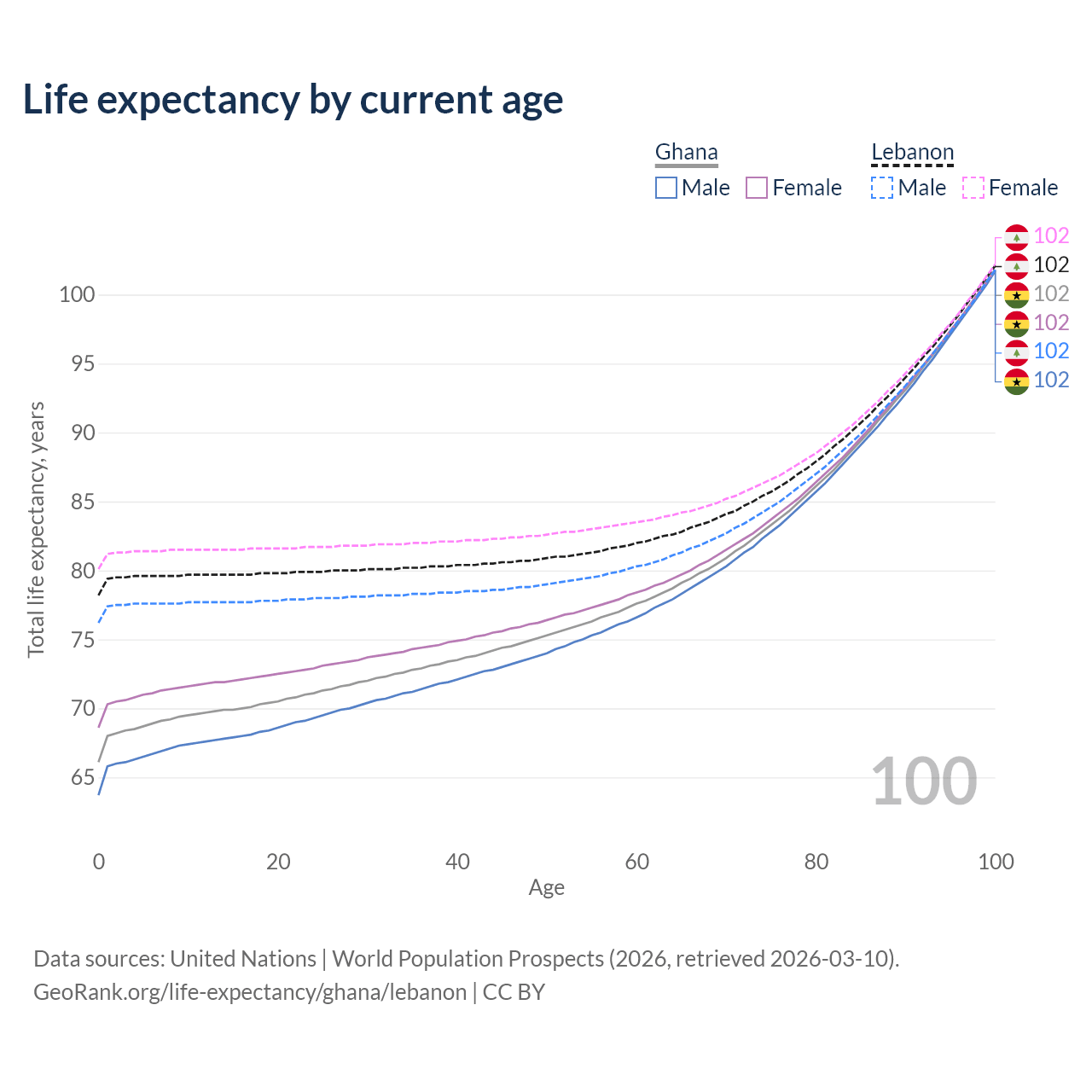 This life expectancy calculator shows the odds of living to 100, 95, 90, and below based on current age for both males and females in Ghana and Lebanon, along with mean and median age of death. The calculations are based on the 2026 life tables (actuarial tables) from the UN World Population Prospects.