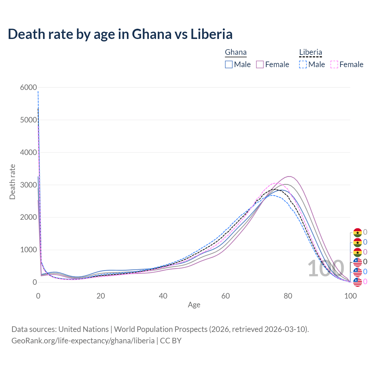 This life expectancy calculator shows the odds of living to 100, 95, 90, and below based on current age for both males and females in Ghana and Liberia, along with mean and median age of death. The calculations are based on the 2026 life tables (actuarial tables) from the UN World Population Prospects.