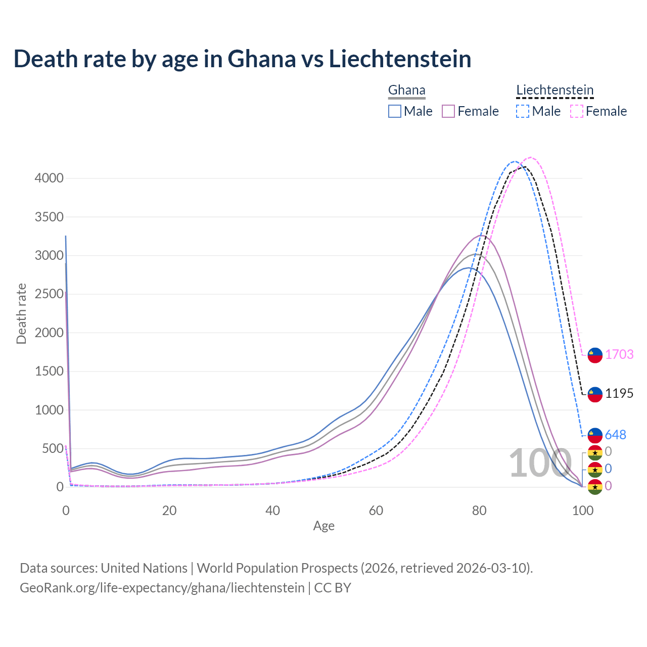 This life expectancy calculator shows the odds of living to 100, 95, 90, and below based on current age for both males and females in Ghana and Liechtenstein, along with mean and median age of death. The calculations are based on the 2026 life tables (actuarial tables) from the UN World Population Prospects.