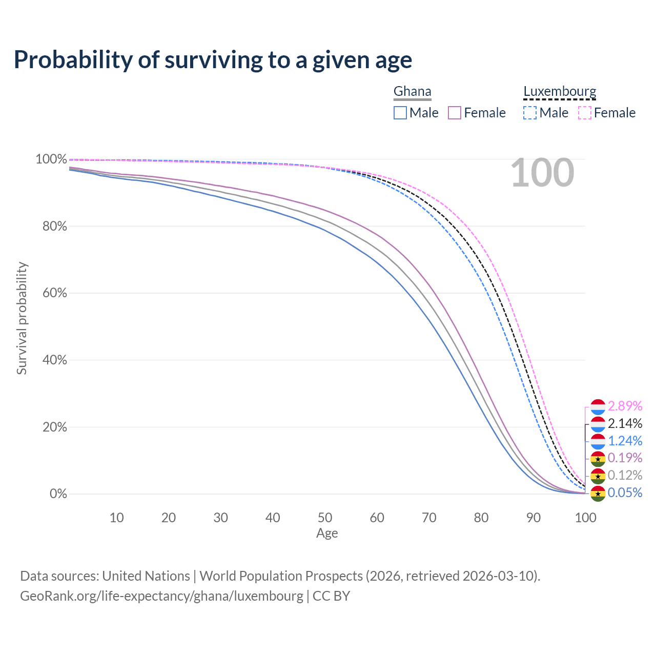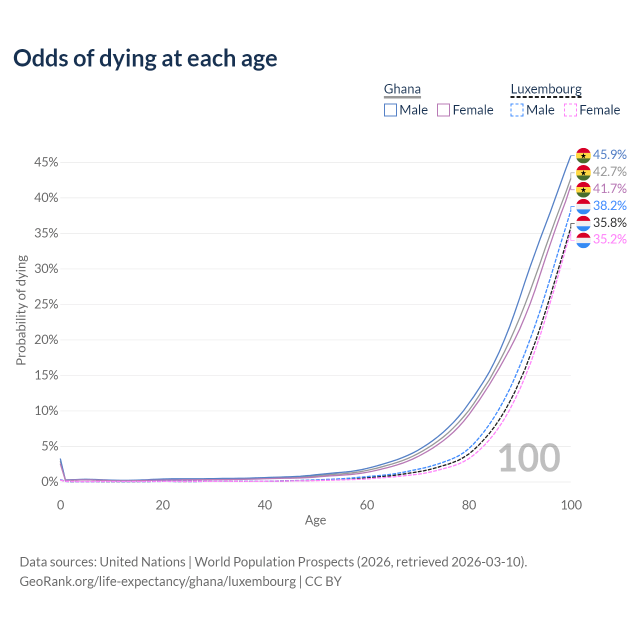 This life expectancy calculator shows the odds of living to 100, 95, 90, and below based on current age for both males and females in Ghana and Luxembourg, along with mean and median age of death. The calculations are based on the 2026 life tables (actuarial tables) from the UN World Population Prospects.
