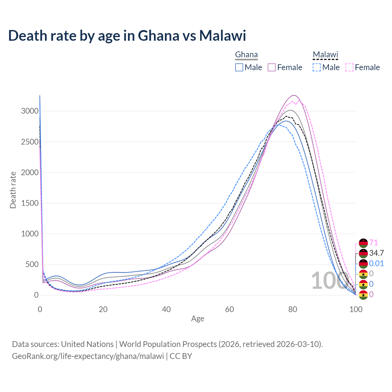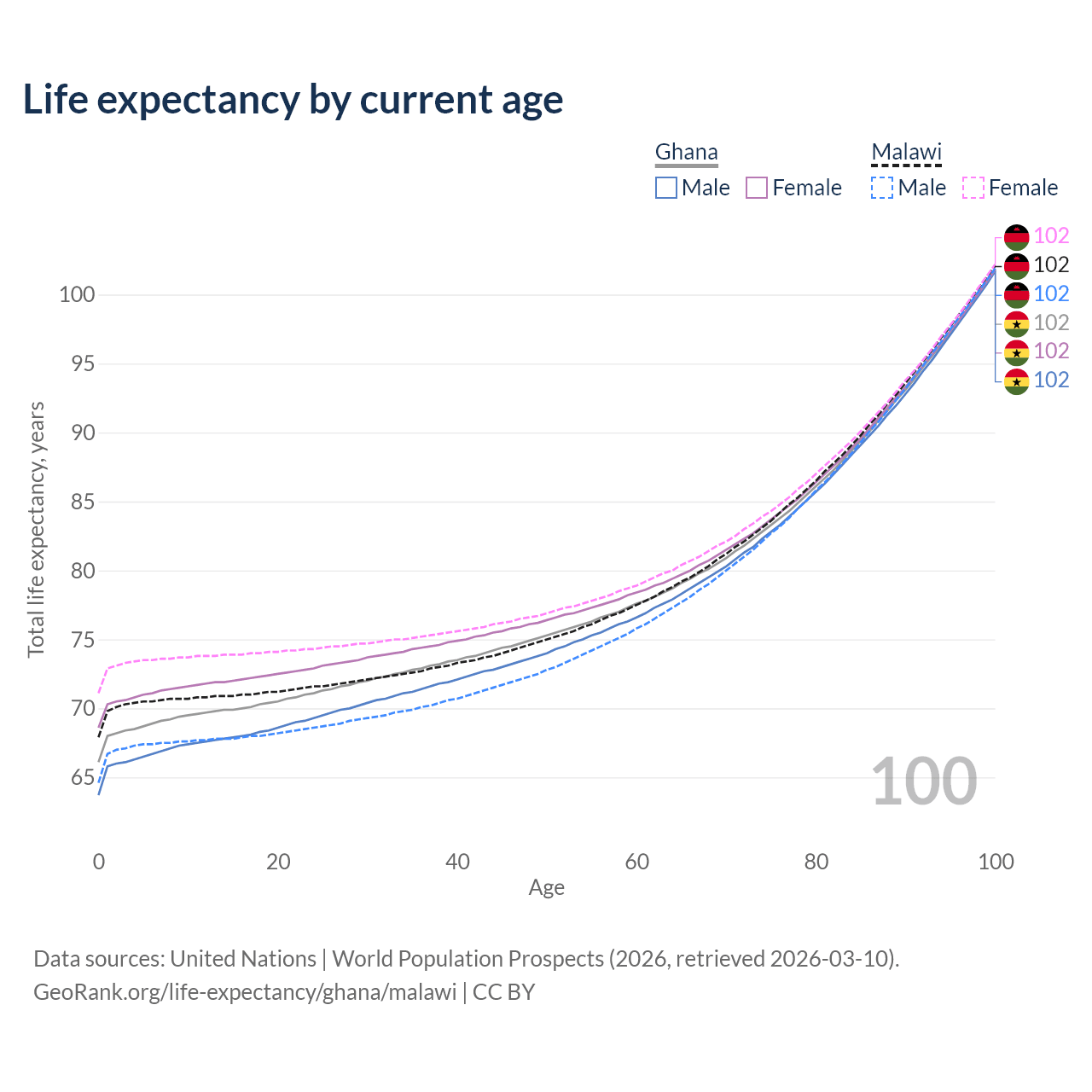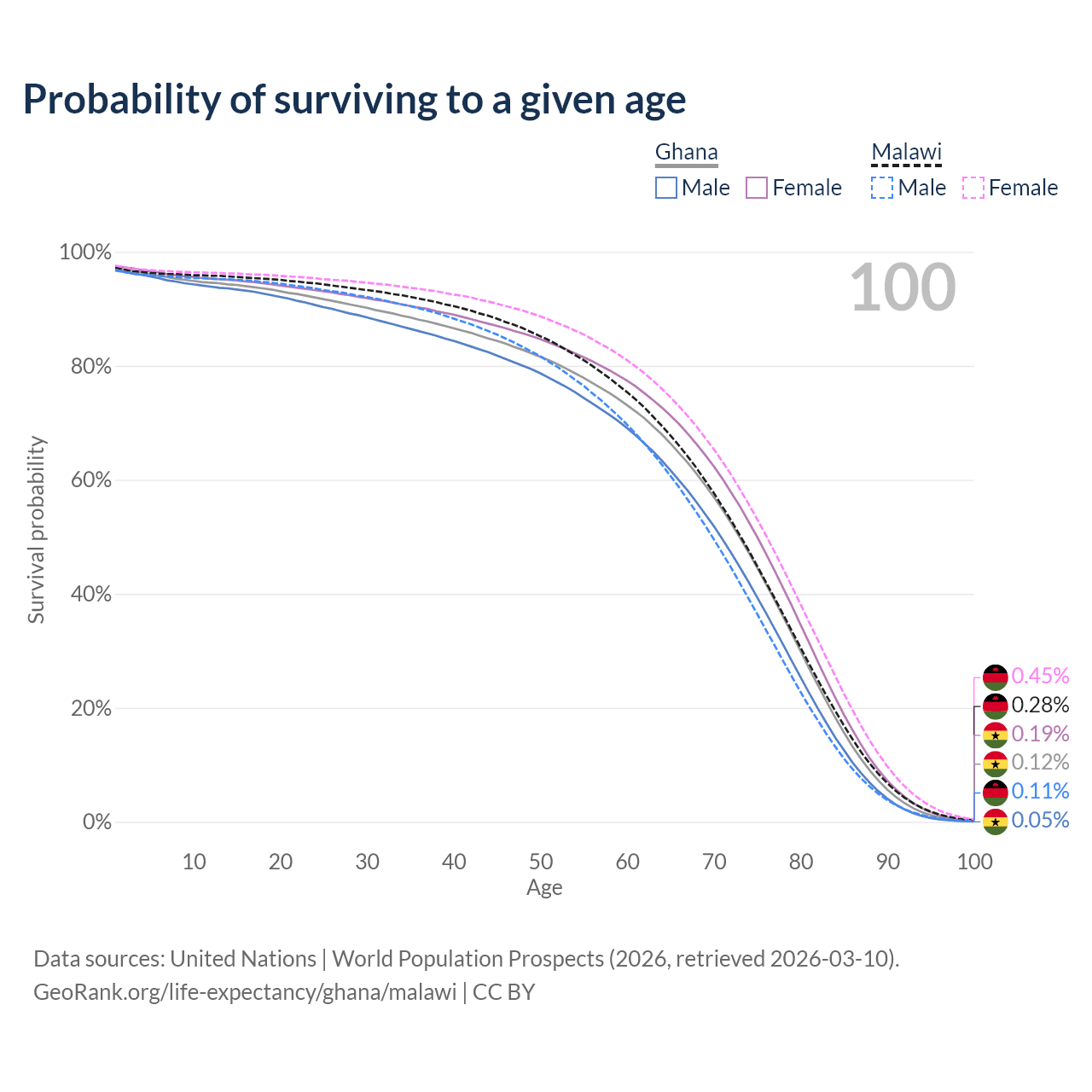 This life expectancy calculator shows the odds of living to 100, 95, 90, and below based on current age for both males and females in Ghana and Malawi, along with mean and median age of death. The calculations are based on the 2026 life tables (actuarial tables) from the UN World Population Prospects.