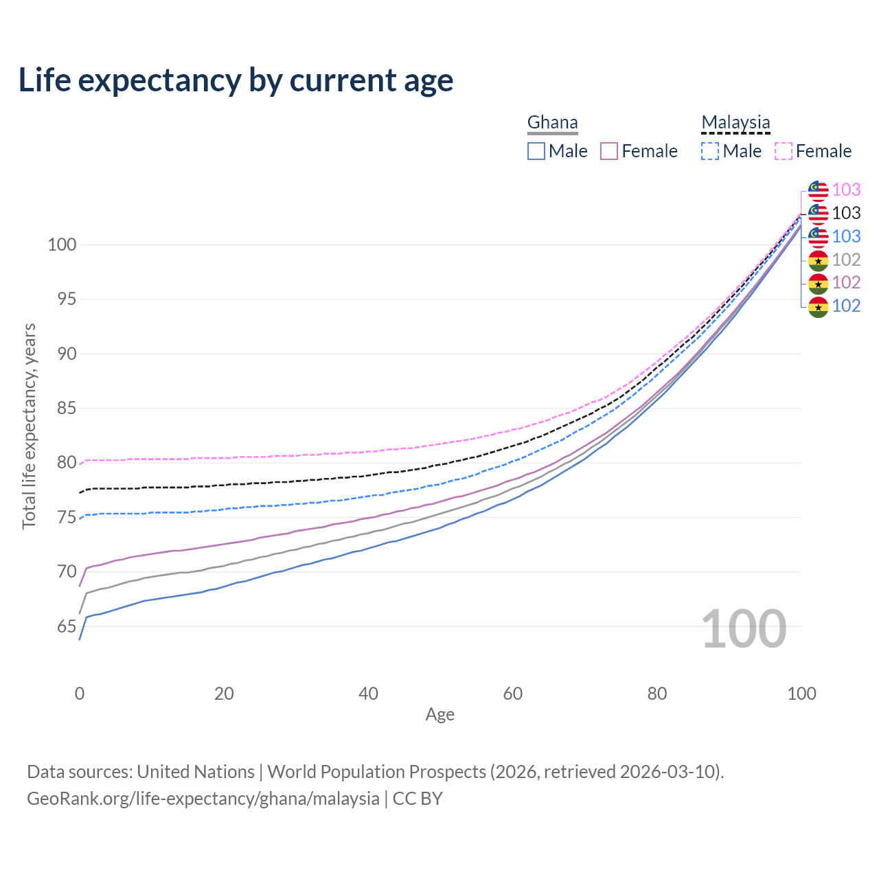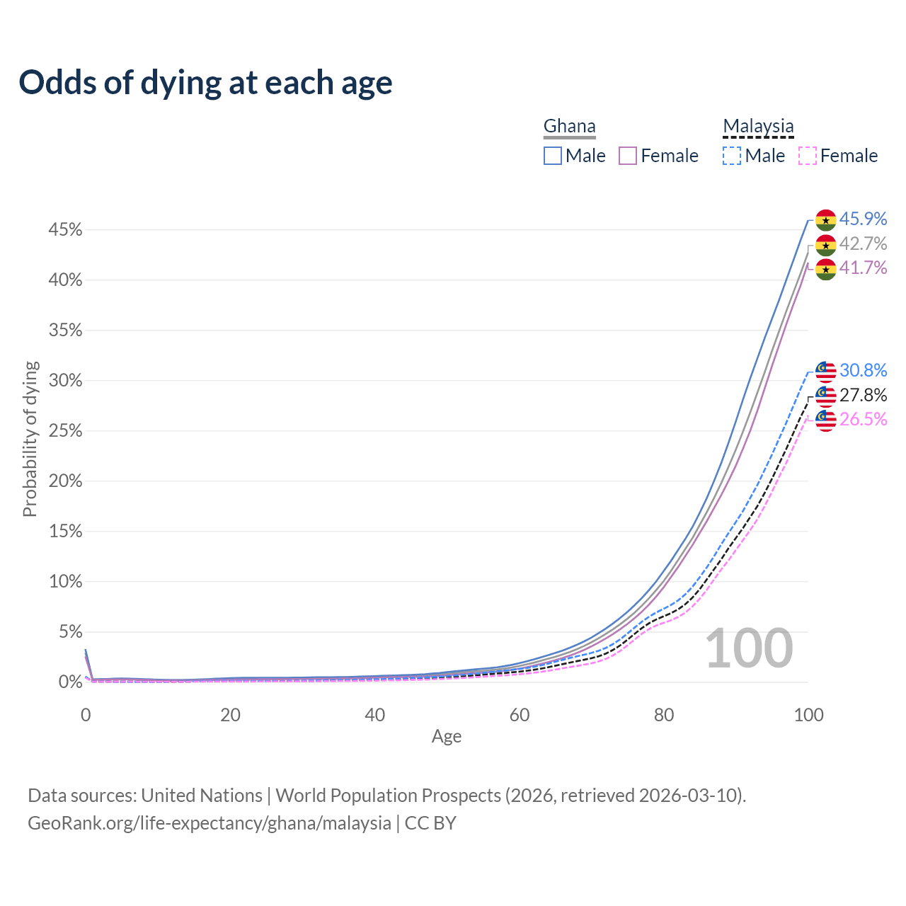 This life expectancy calculator shows the odds of living to 100, 95, 90, and below based on current age for both males and females in Ghana and Malaysia, along with mean and median age of death. The calculations are based on the 2026 life tables (actuarial tables) from the UN World Population Prospects.