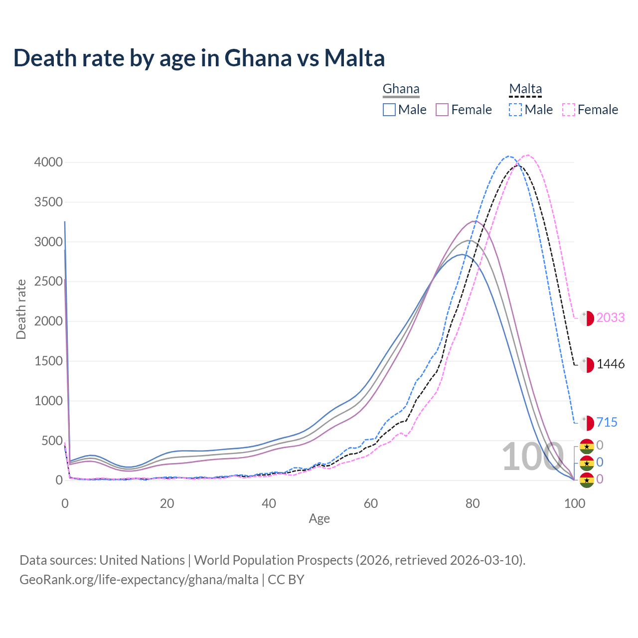 This life expectancy calculator shows the odds of living to 100, 95, 90, and below based on current age for both males and females in Ghana and Malta, along with mean and median age of death. The calculations are based on the 2026 life tables (actuarial tables) from the UN World Population Prospects.