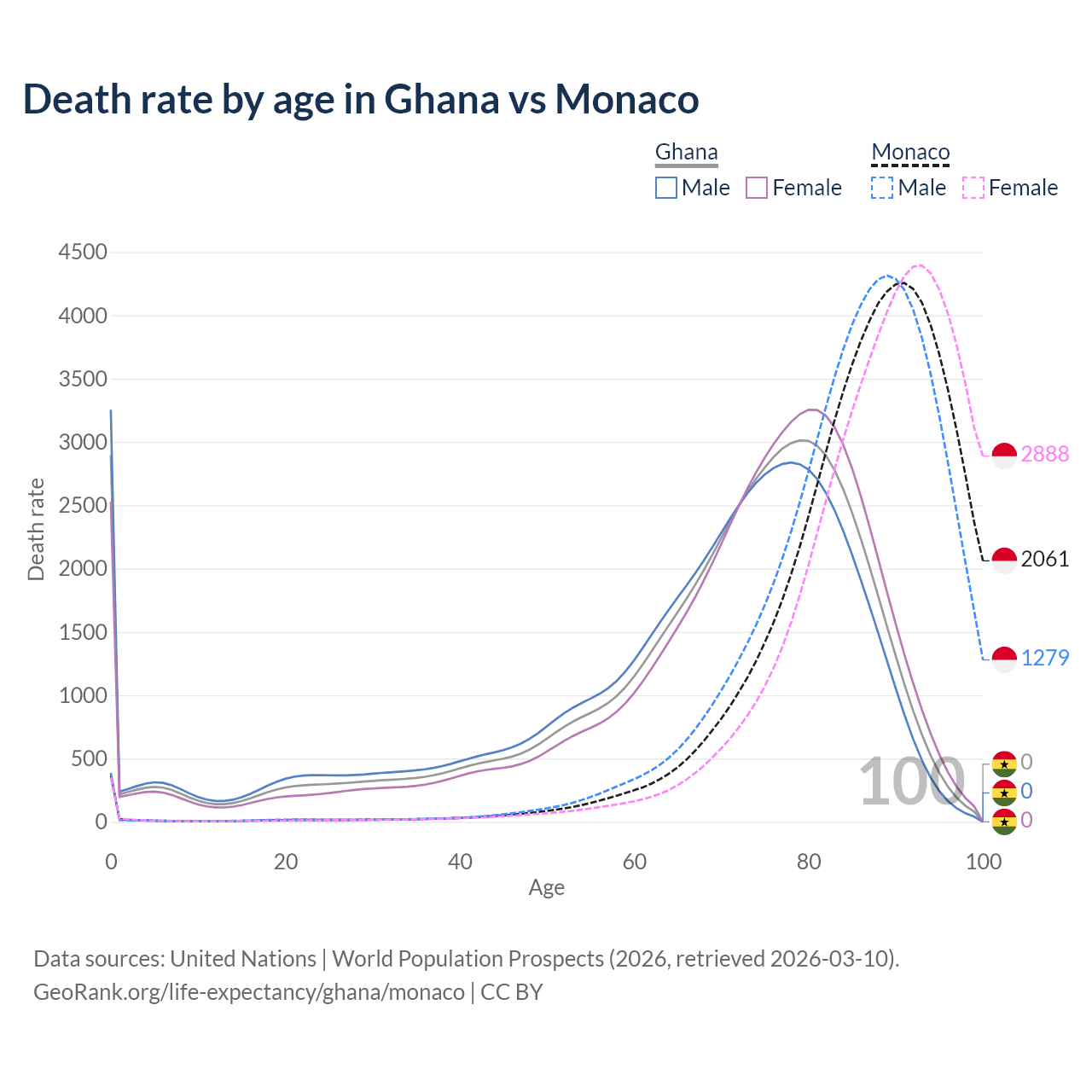 In Ghana, the most common age of death is 79, compared to 91 in Monaco. The median age of death is 73 in Ghana and 88.7 in Monaco, meaning only half of each cohort is expected to live past that age.