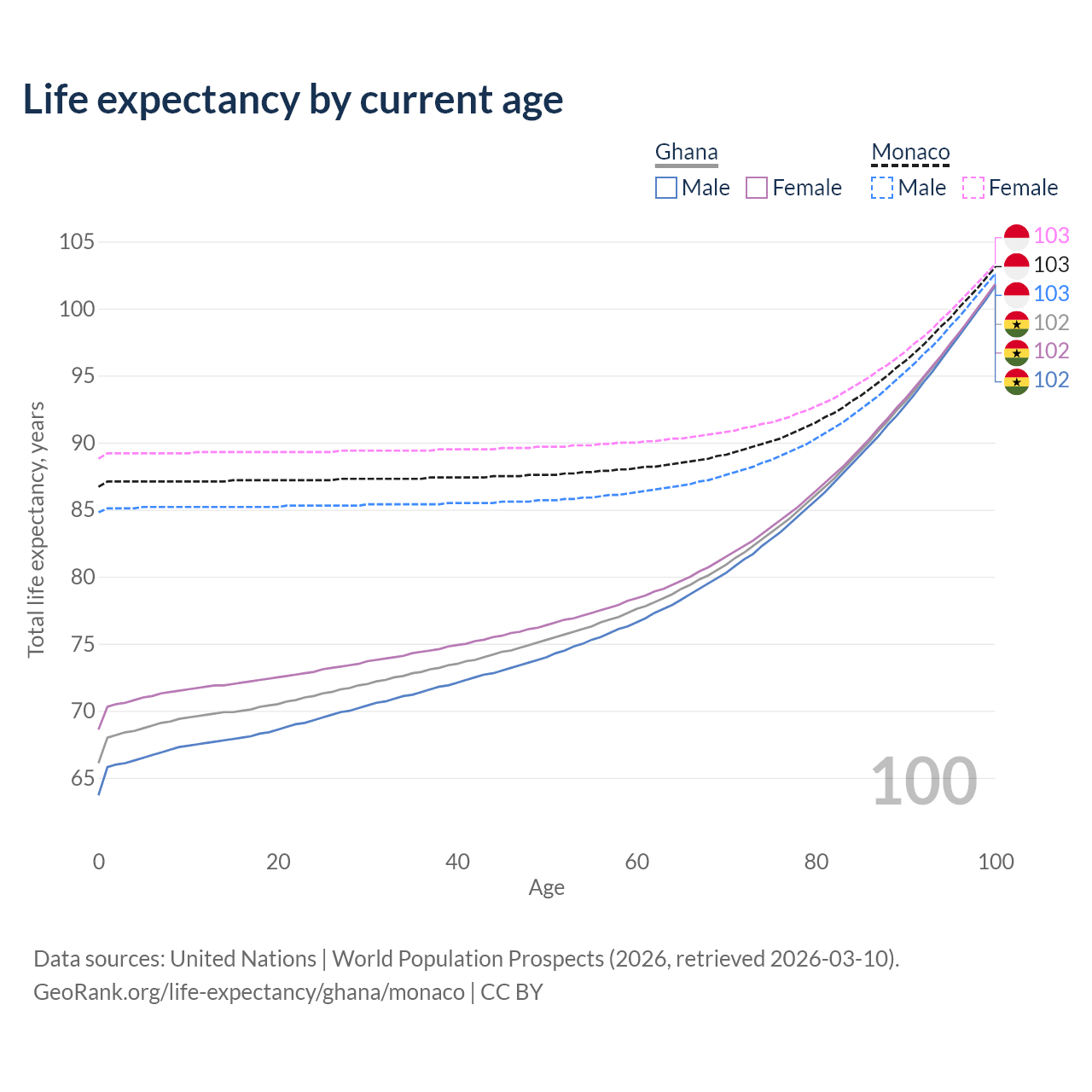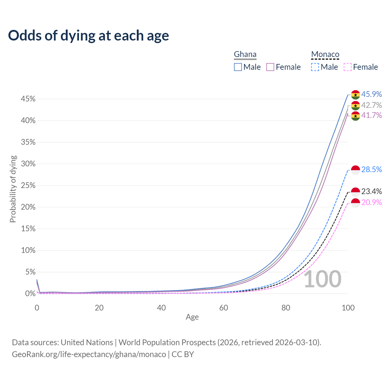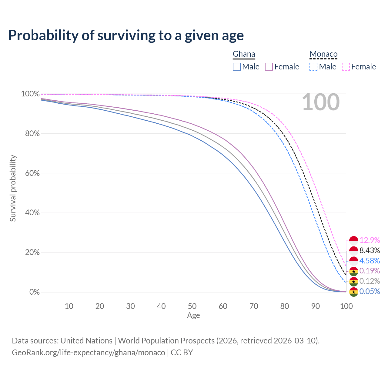 This life expectancy calculator shows the odds of living to 100, 95, 90, and below based on current age for both males and females in Ghana and Monaco, along with mean and median age of death. The calculations are based on the 2026 life tables (actuarial tables) from the UN World Population Prospects.