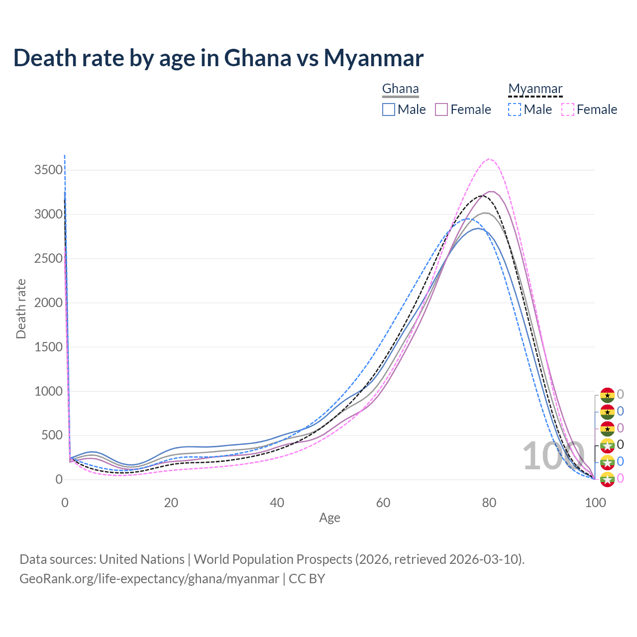 The average life expectancy at birth is 66.1 years in Ghana vs 67.5 in Myanmar. Ghana is ranked 169/197 by life expectancy, and Myanmar is 157/197. In Ghana, the life expectancy is 63.7 years for males and 68.6 years for females. In Myanmar, it's 64.4 years for males and 70.8 years for females.