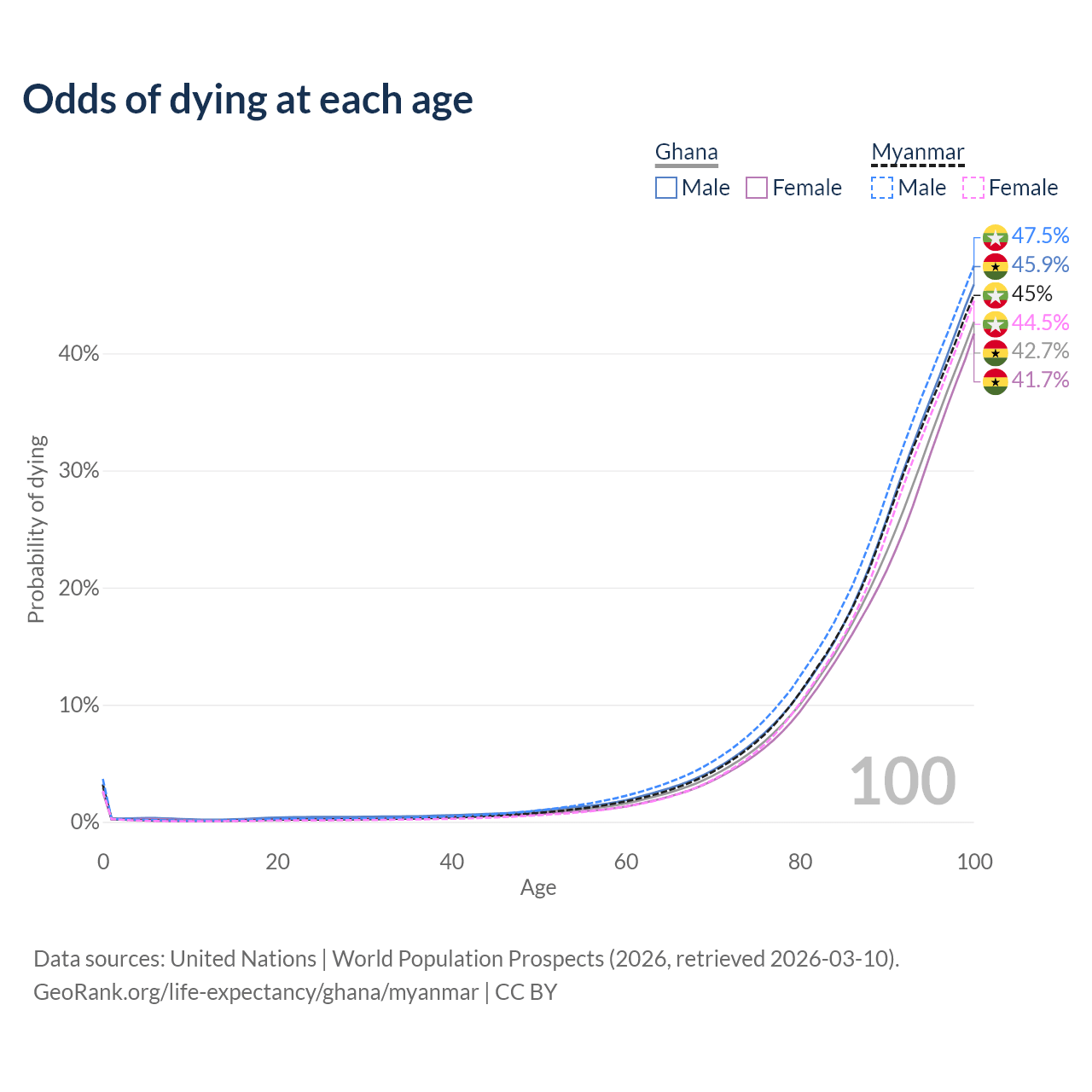 This life expectancy calculator shows the odds of living to 100, 95, 90, and below based on current age for both males and females in Ghana and Myanmar, along with mean and median age of death. The calculations are based on the 2026 life tables (actuarial tables) from the UN World Population Prospects.