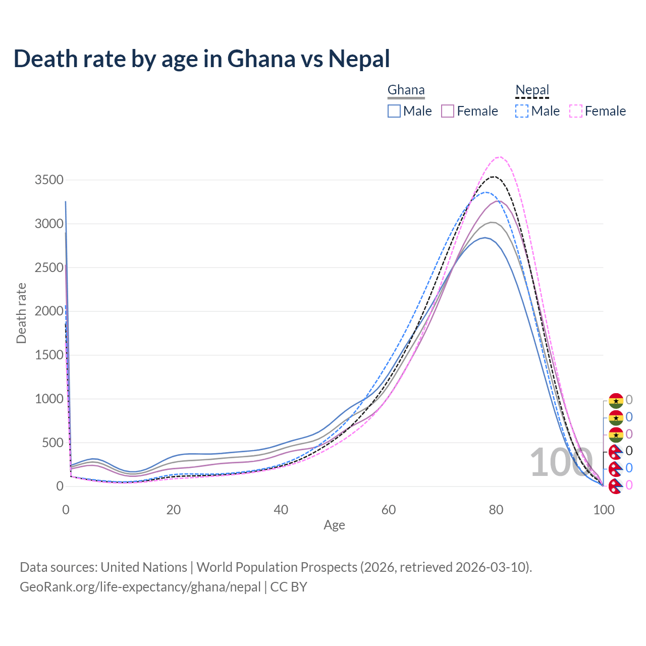 Note that this chart does not show rates per 100,000 population, as those would be skewed by age structure differences and reflect the demographics of Ghana and Nepal more than their death rates.