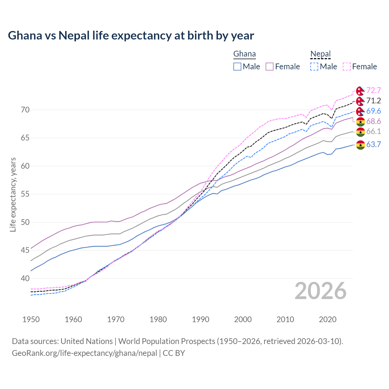 The average life expectancy at birth is 66.1 years in Ghana vs 71.2 in Nepal. Ghana is ranked 169/197 by life expectancy, and Nepal is 131/197. In Ghana, the life expectancy is 63.7 years for males and 68.6 years for females. In Nepal, it's 69.6 years for males and 72.7 years for females.