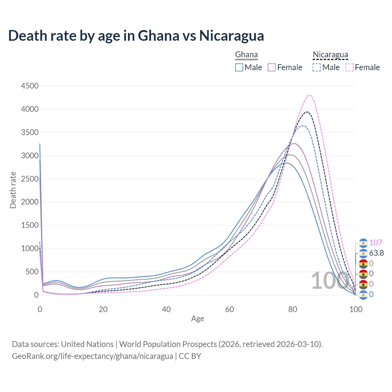 In Ghana, the most common age of death is 79, compared to 85 in Nicaragua. The median age of death is 73 in Ghana and 79.9 in Nicaragua, meaning only half of each cohort is expected to live past that age.