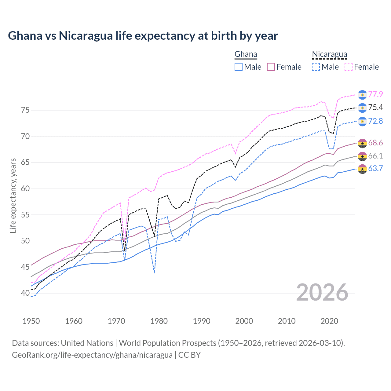 The average life expectancy at birth is 66.1 years in Ghana vs 75.4 in Nicaragua. Ghana is ranked 169/197 by life expectancy, and Nicaragua is 91/197. In Ghana, the life expectancy is 63.7 years for males and 68.6 years for females. In Nicaragua, it's 72.8 years for males and 77.9 years for females.