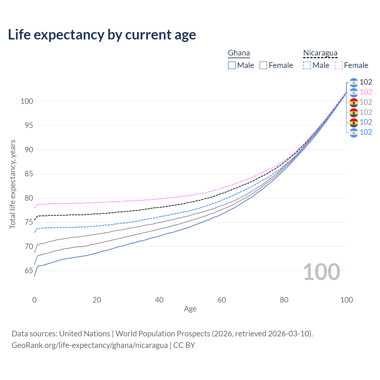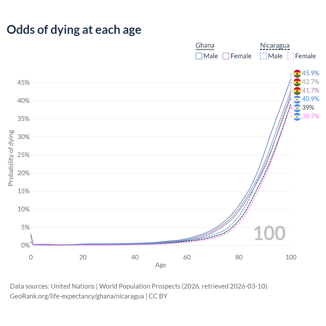 This life expectancy calculator shows the odds of living to 100, 95, 90, and below based on current age for both males and females in Ghana and Nicaragua, along with mean and median age of death. The calculations are based on the 2026 life tables (actuarial tables) from the UN World Population Prospects.