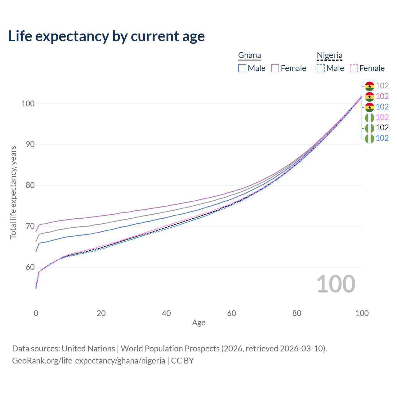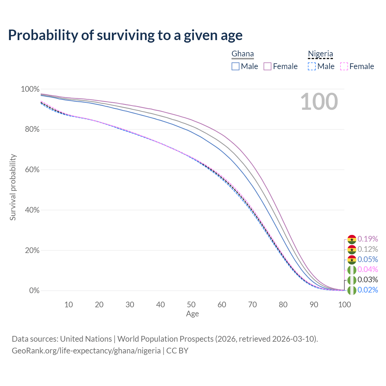 This life expectancy calculator shows the odds of living to 100, 95, 90, and below based on current age for both males and females in Ghana and Nigeria, along with mean and median age of death. The calculations are based on the 2026 life tables (actuarial tables) from the UN World Population Prospects.