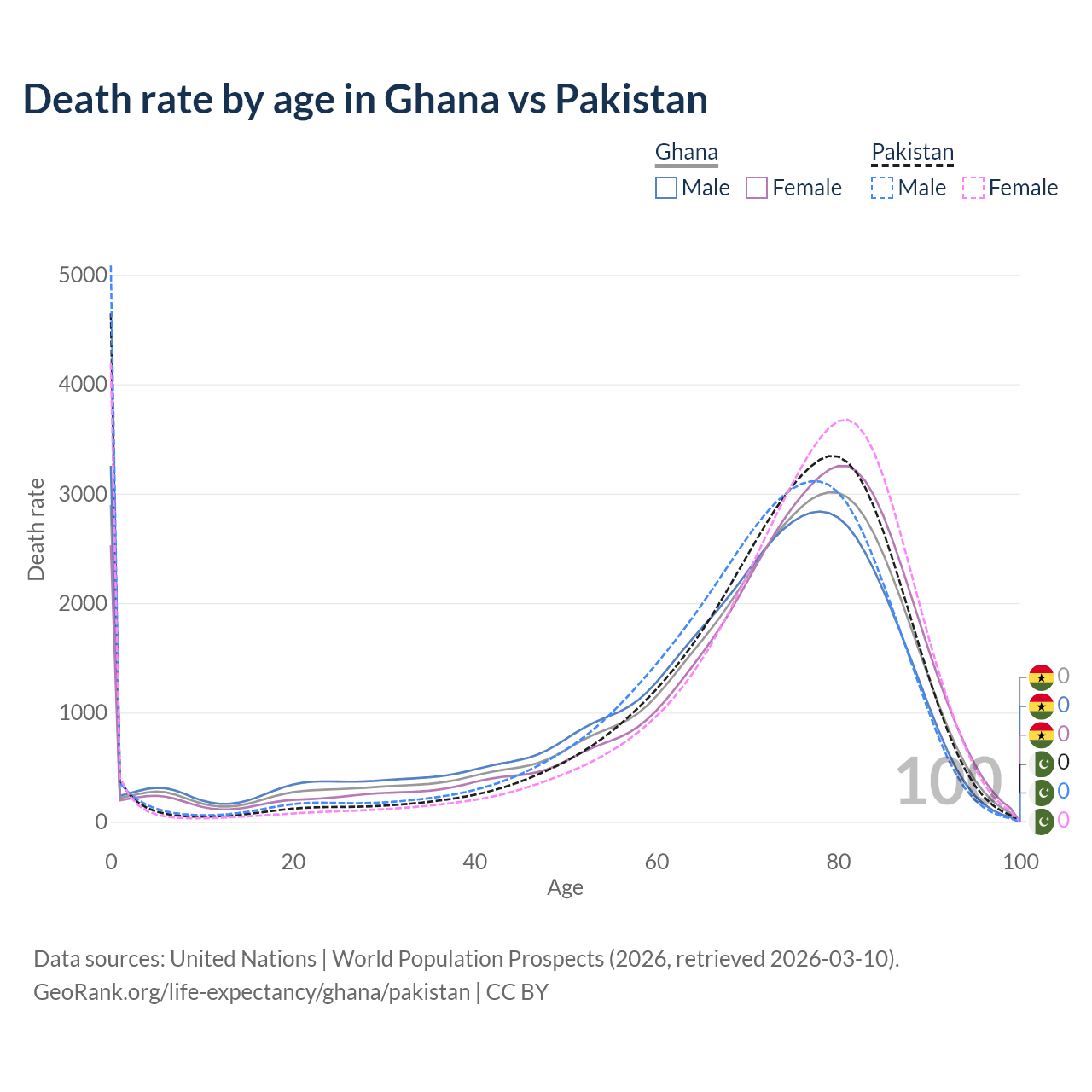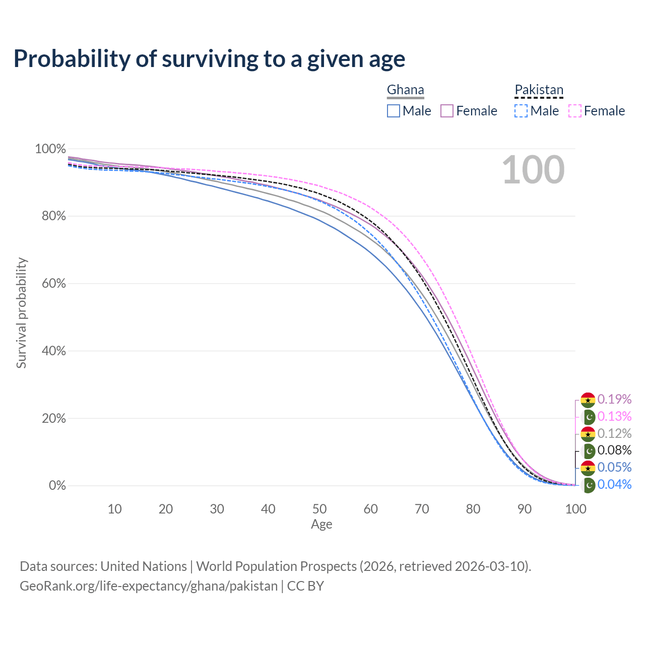 This life expectancy calculator shows the odds of living to 100, 95, 90, and below based on current age for both males and females in Ghana and Pakistan, along with mean and median age of death. The calculations are based on the 2026 life tables (actuarial tables) from the UN World Population Prospects.