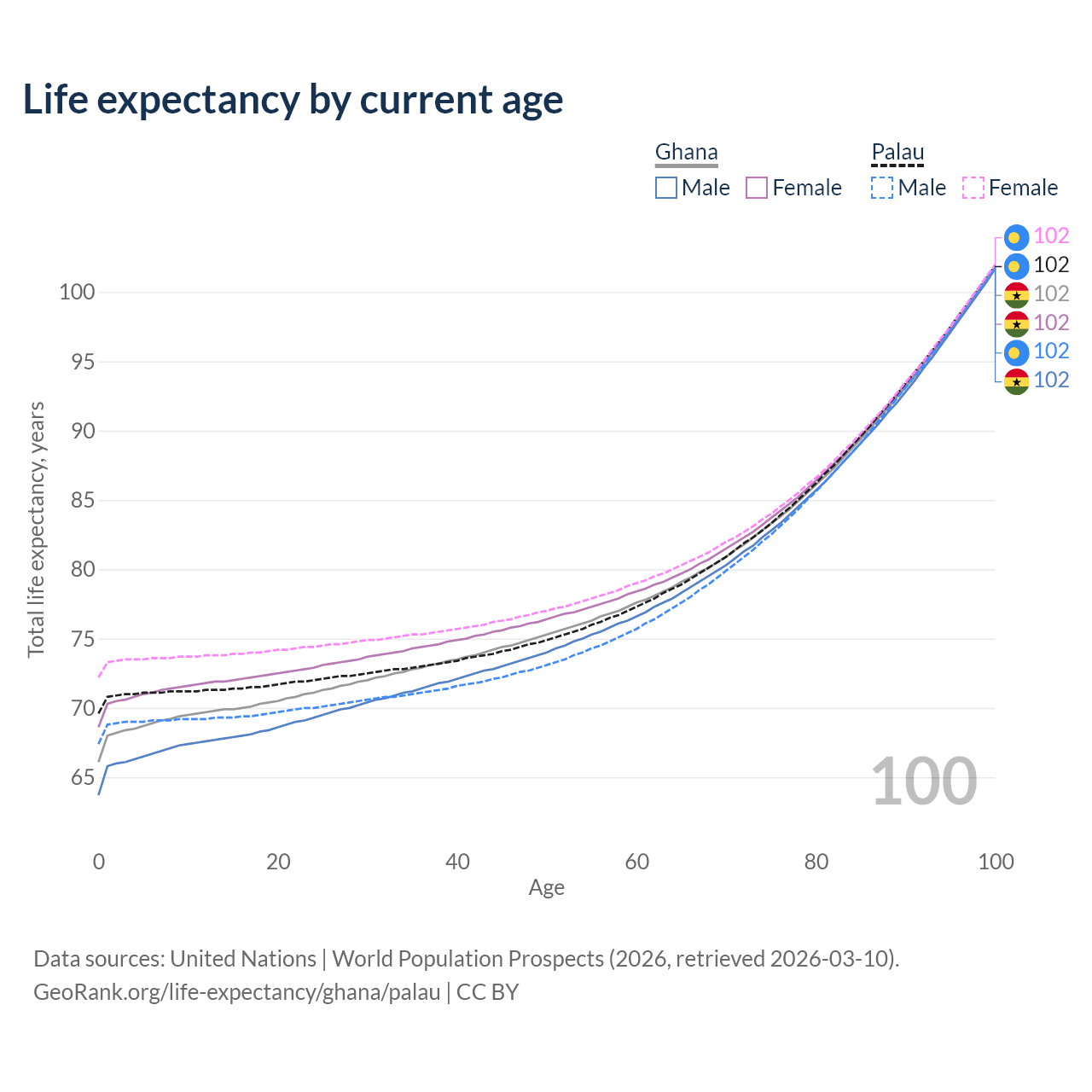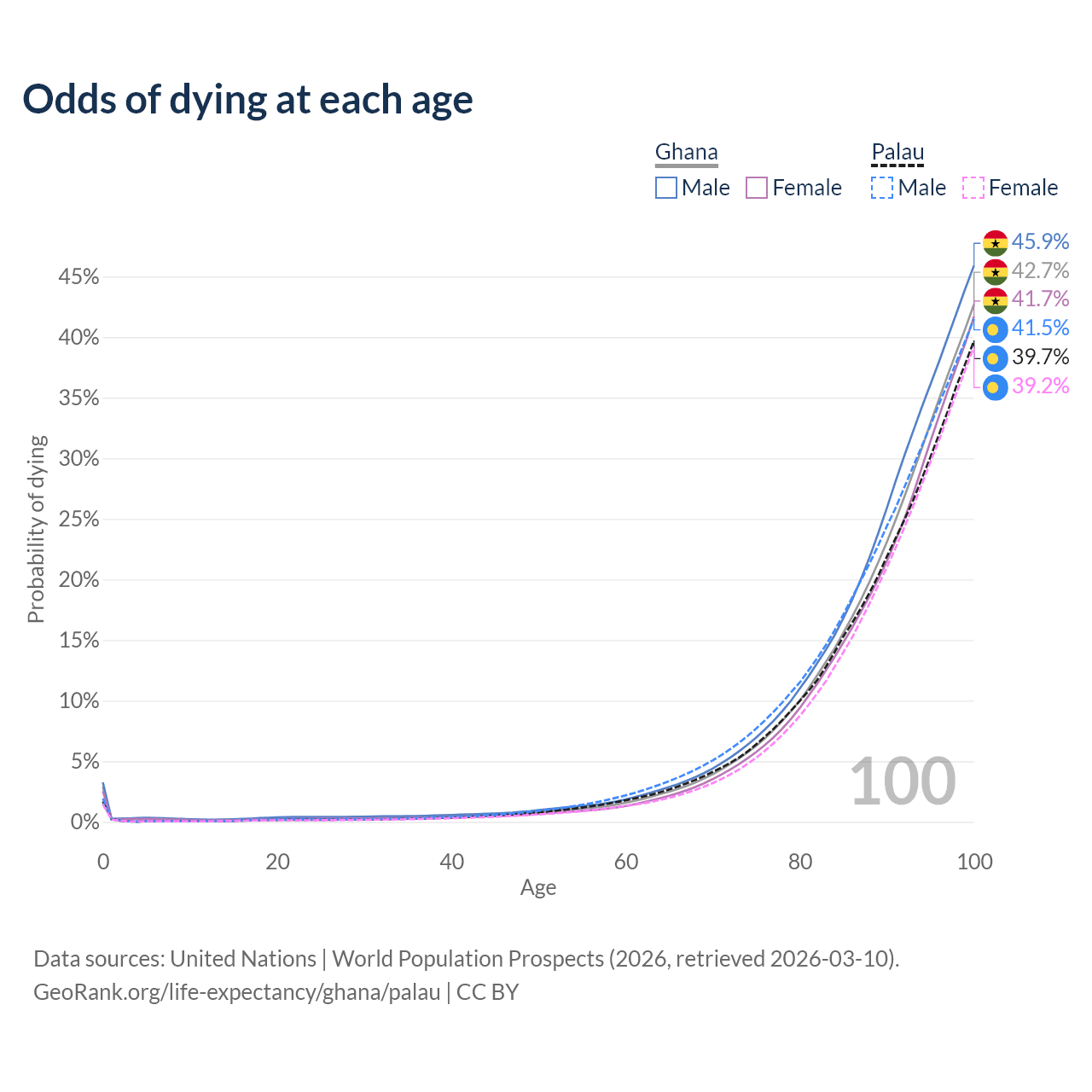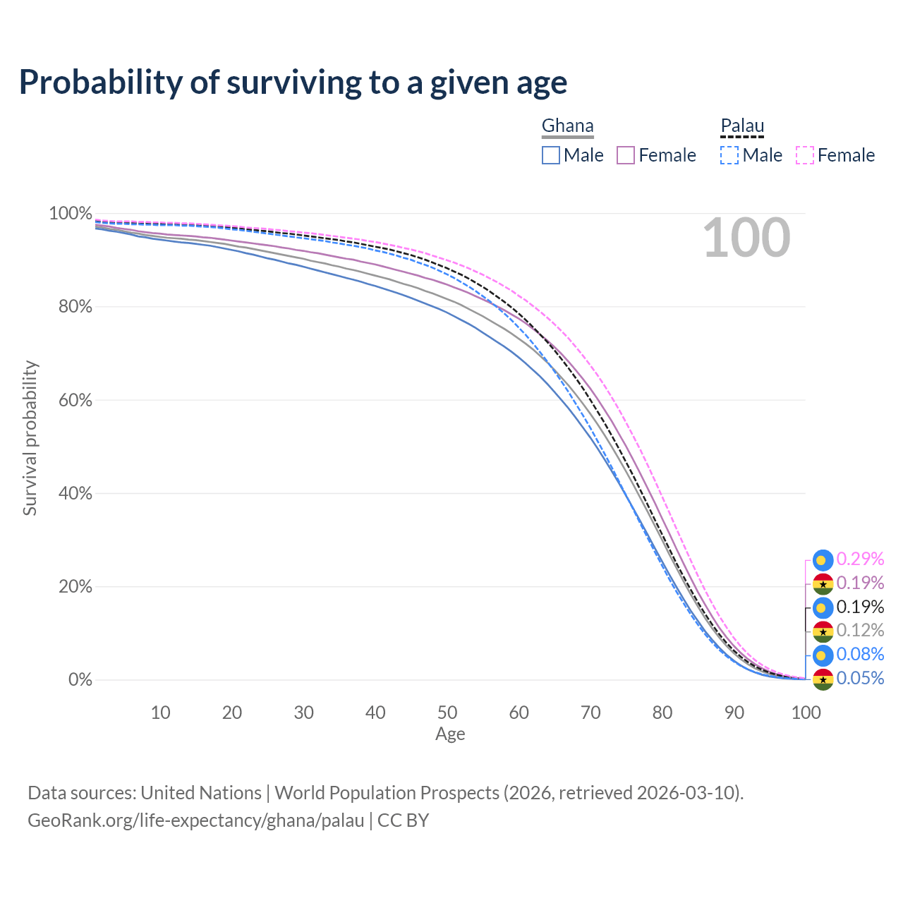 This life expectancy calculator shows the odds of living to 100, 95, 90, and below based on current age for both males and females in Ghana and Palau, along with mean and median age of death. The calculations are based on the 2026 life tables (actuarial tables) from the UN World Population Prospects.