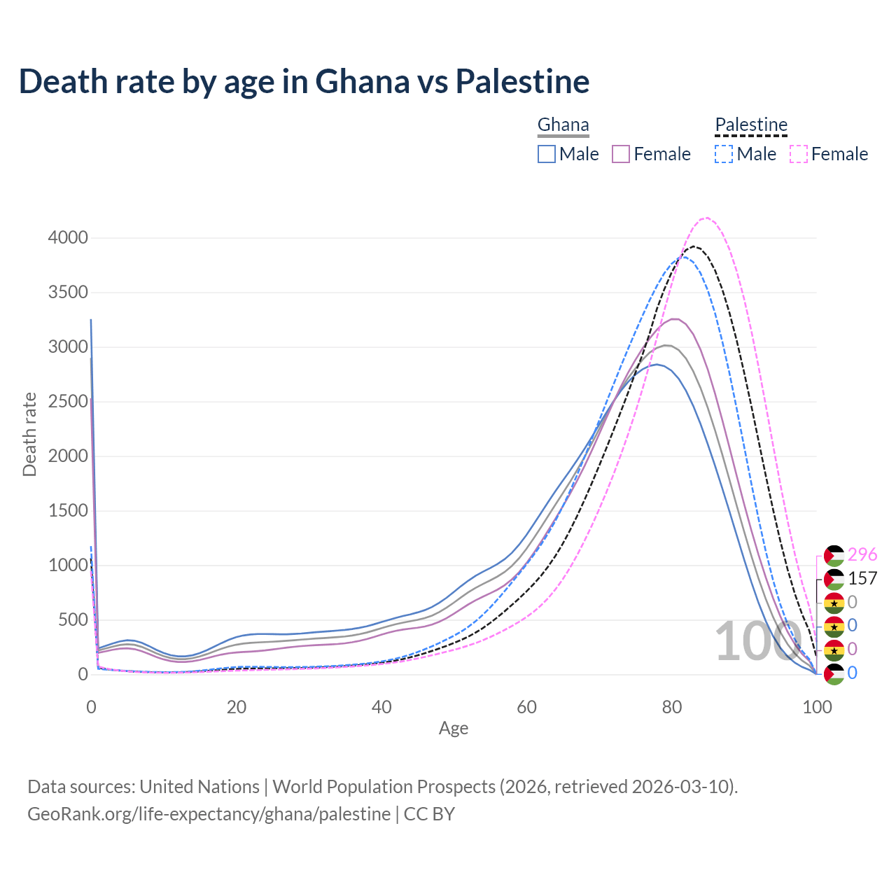 The average life expectancy at birth is 66.1 years in Ghana vs 77.4 in Palestine. Ghana is ranked 169/197 by life expectancy, and Palestine is 70/197. In Ghana, the life expectancy is 63.7 years for males and 68.6 years for females. In Palestine, it's 75 years for males and 79.8 years for females.