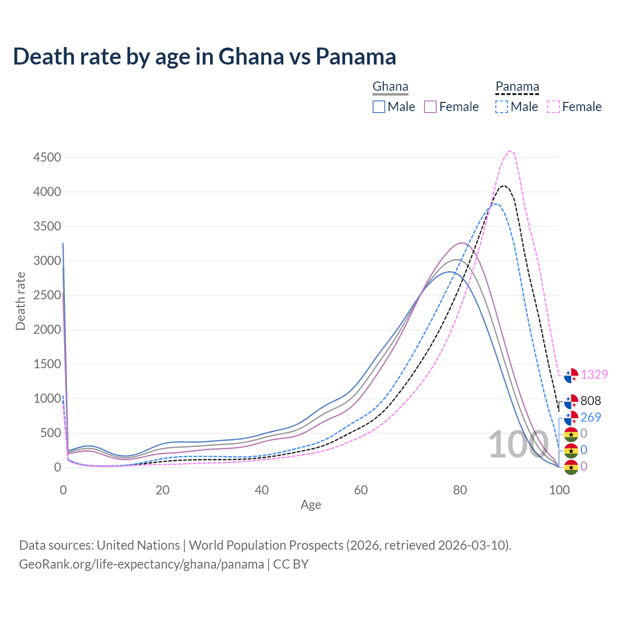 In Ghana, the most common age of death is 79, compared to 89 in Panama. The median age of death is 73 in Ghana and 84.6 in Panama, meaning only half of each cohort is expected to live past that age.