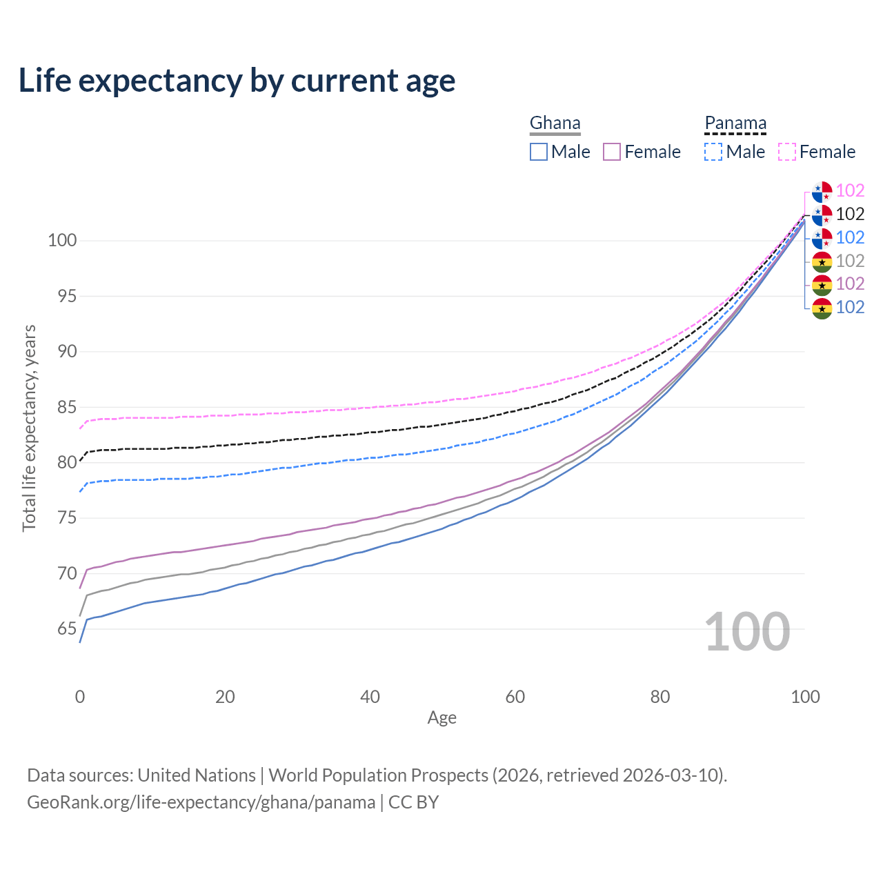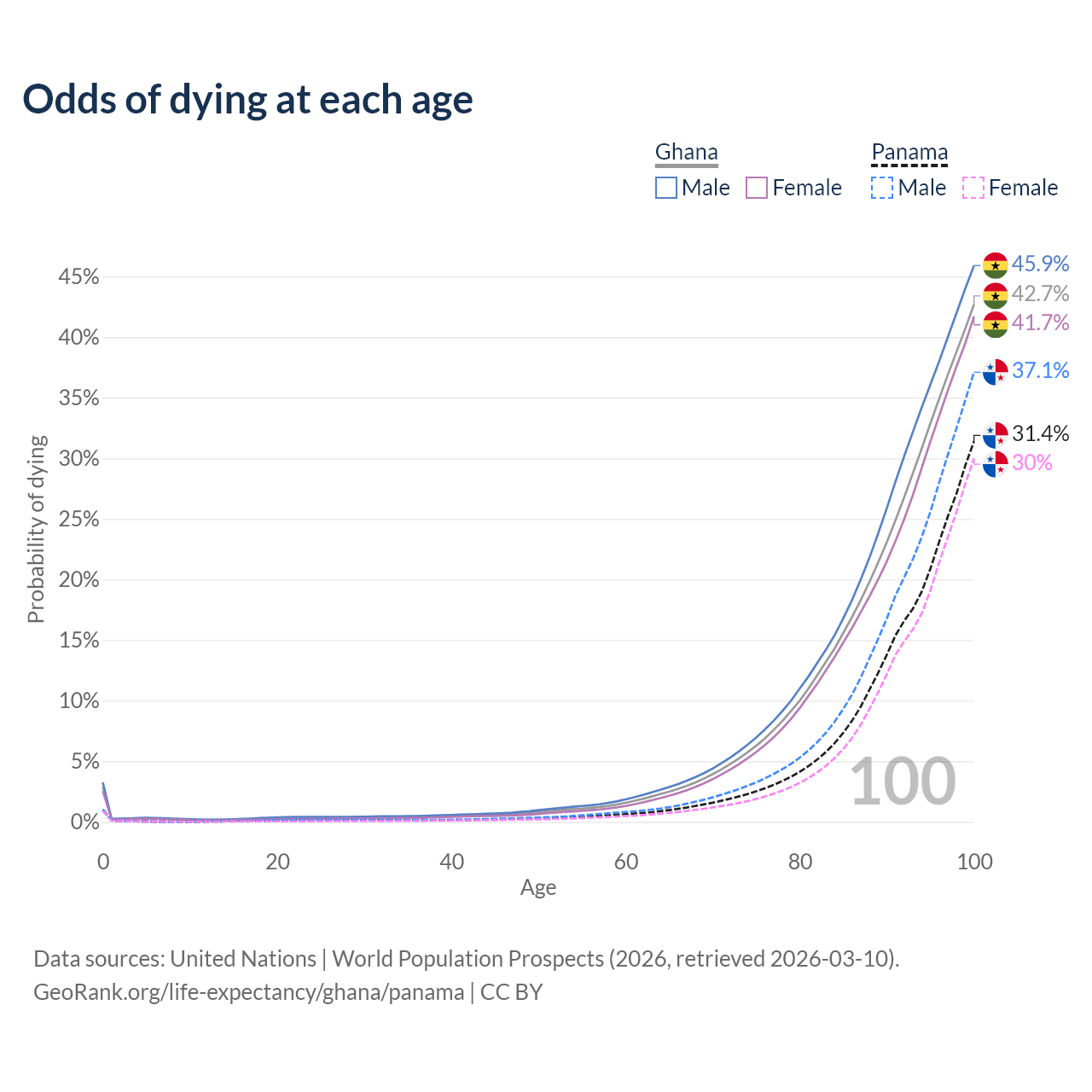 This life expectancy calculator shows the odds of living to 100, 95, 90, and below based on current age for both males and females in Ghana and Panama, along with mean and median age of death. The calculations are based on the 2026 life tables (actuarial tables) from the UN World Population Prospects.
