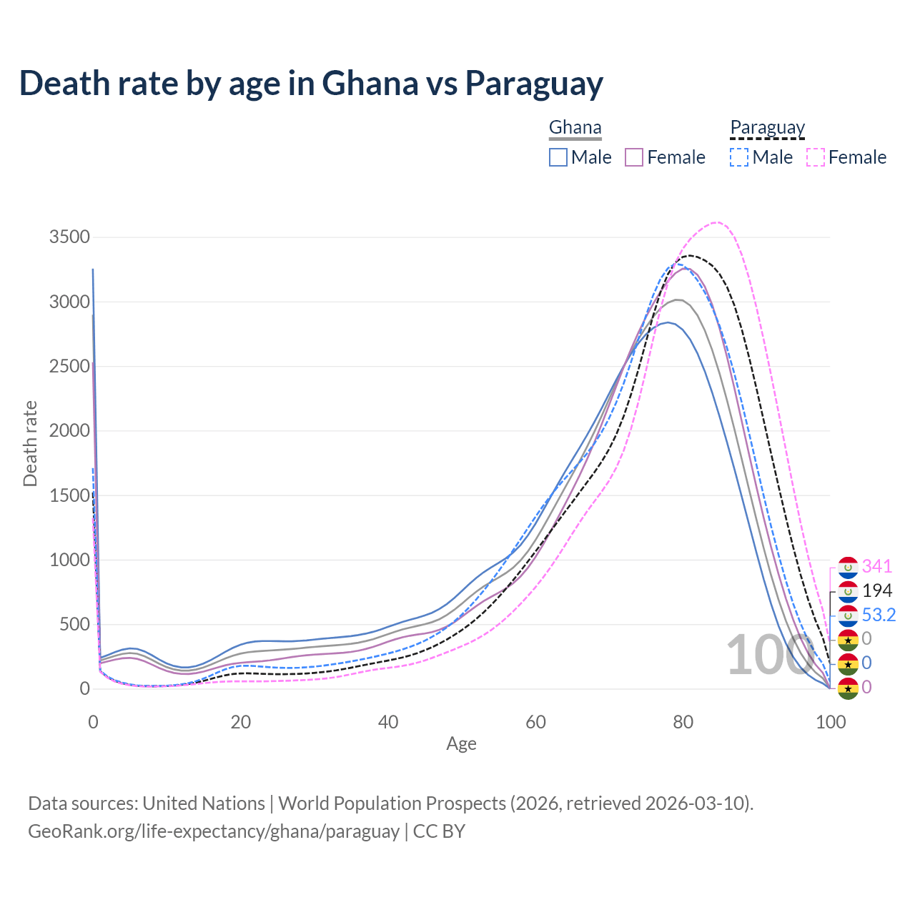 The average life expectancy at birth is 66.1 years in Ghana vs 74.2 in Paraguay. Ghana is ranked 169/197 by life expectancy, and Paraguay is 100/197. In Ghana, the life expectancy is 63.7 years for males and 68.6 years for females. In Paraguay, it's 71.3 years for males and 77.4 years for females.