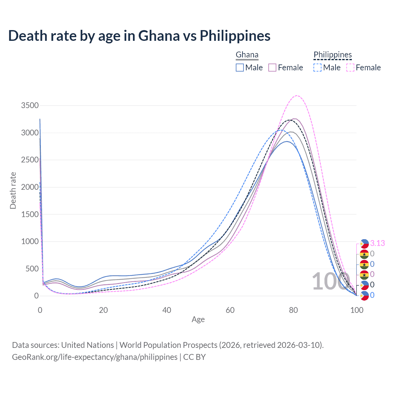 In Ghana, the most common age of death is 79, compared to 79 in the Philippines. The median age of death is 73 in Ghana and 74.6 in the Philippines, meaning only half of each cohort is expected to live past that age.