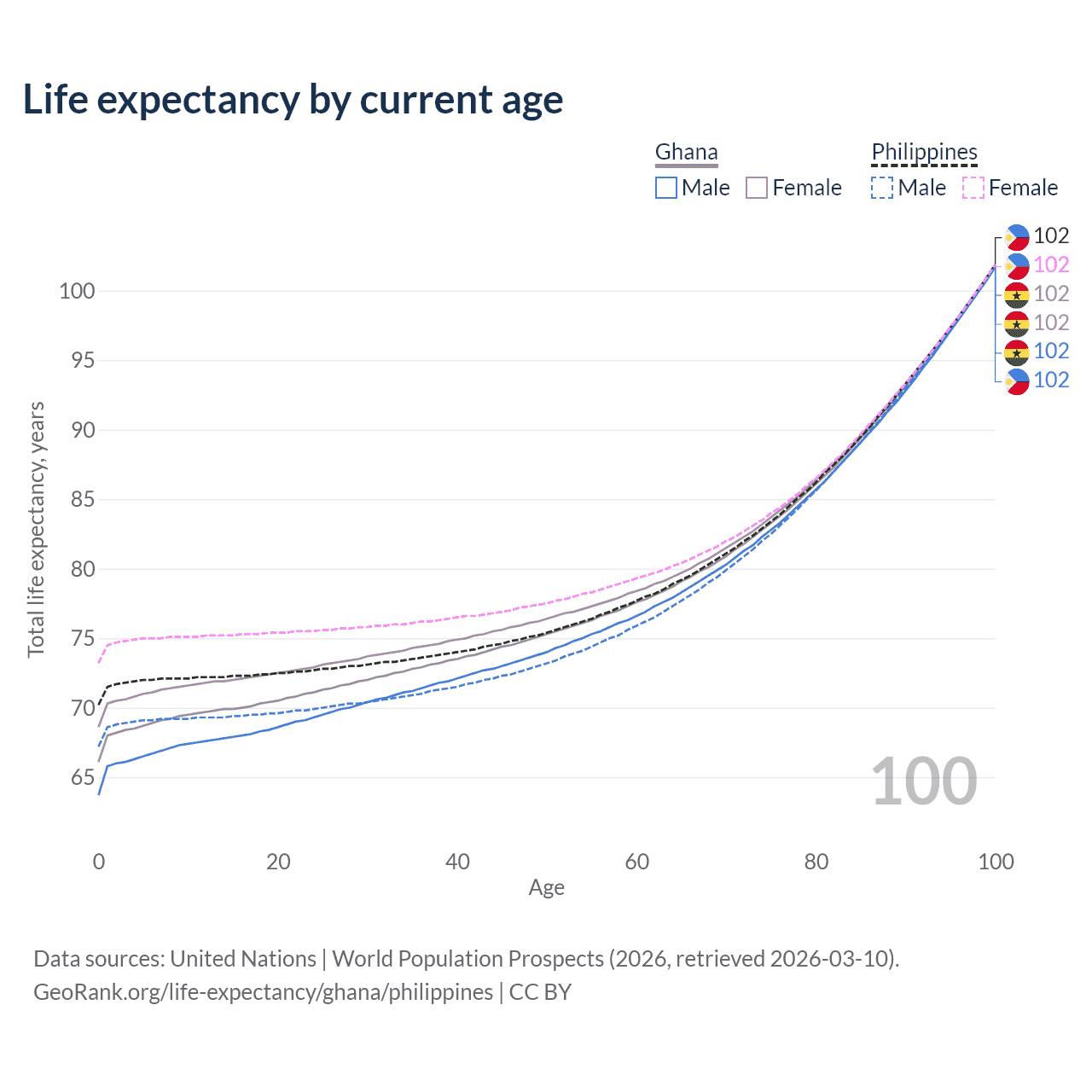 This life expectancy calculator shows the odds of living to 100, 95, 90, and below based on current age for both males and females in Ghana and the Philippines, along with mean and median age of death. The calculations are based on the 2026 life tables (actuarial tables) from the UN World Population Prospects.