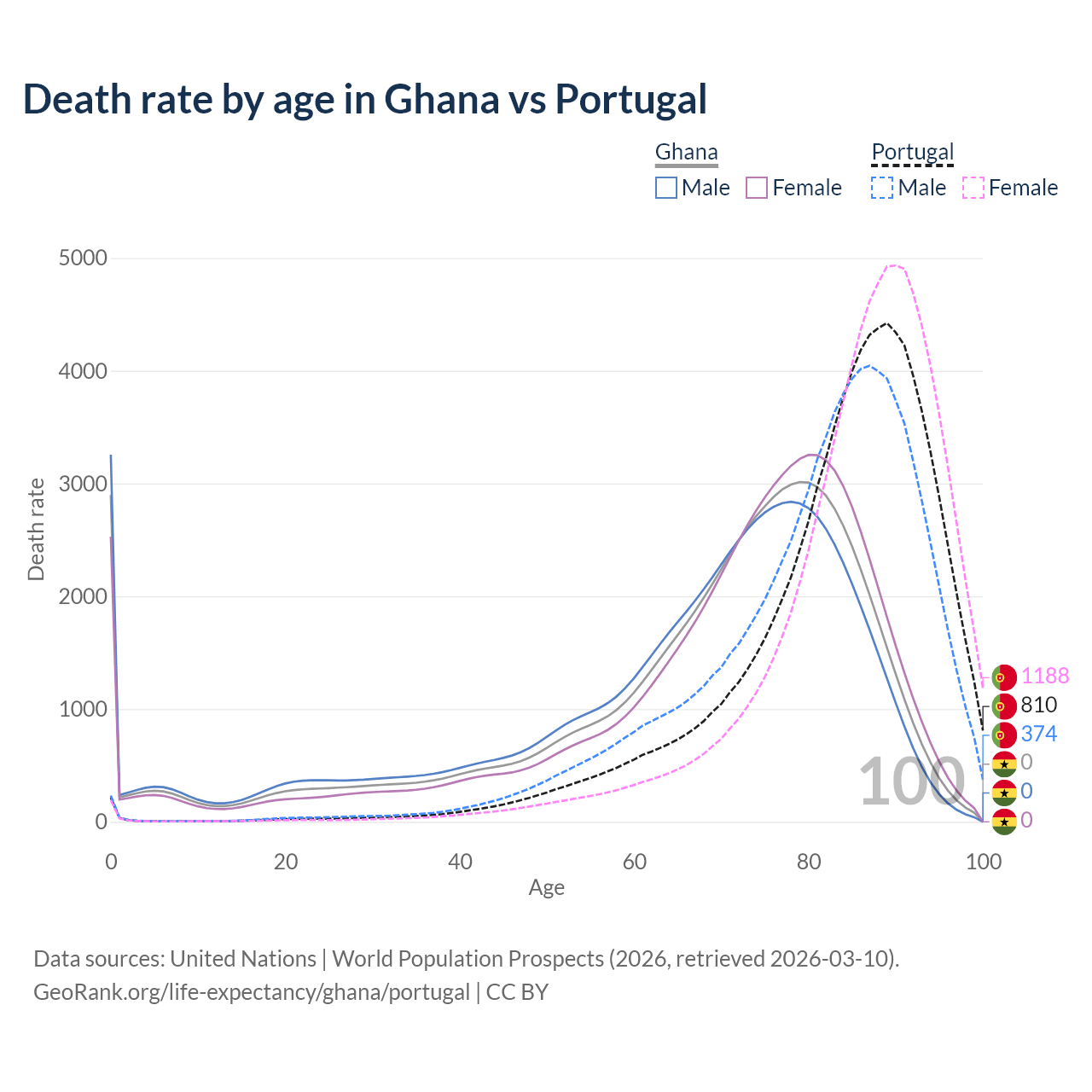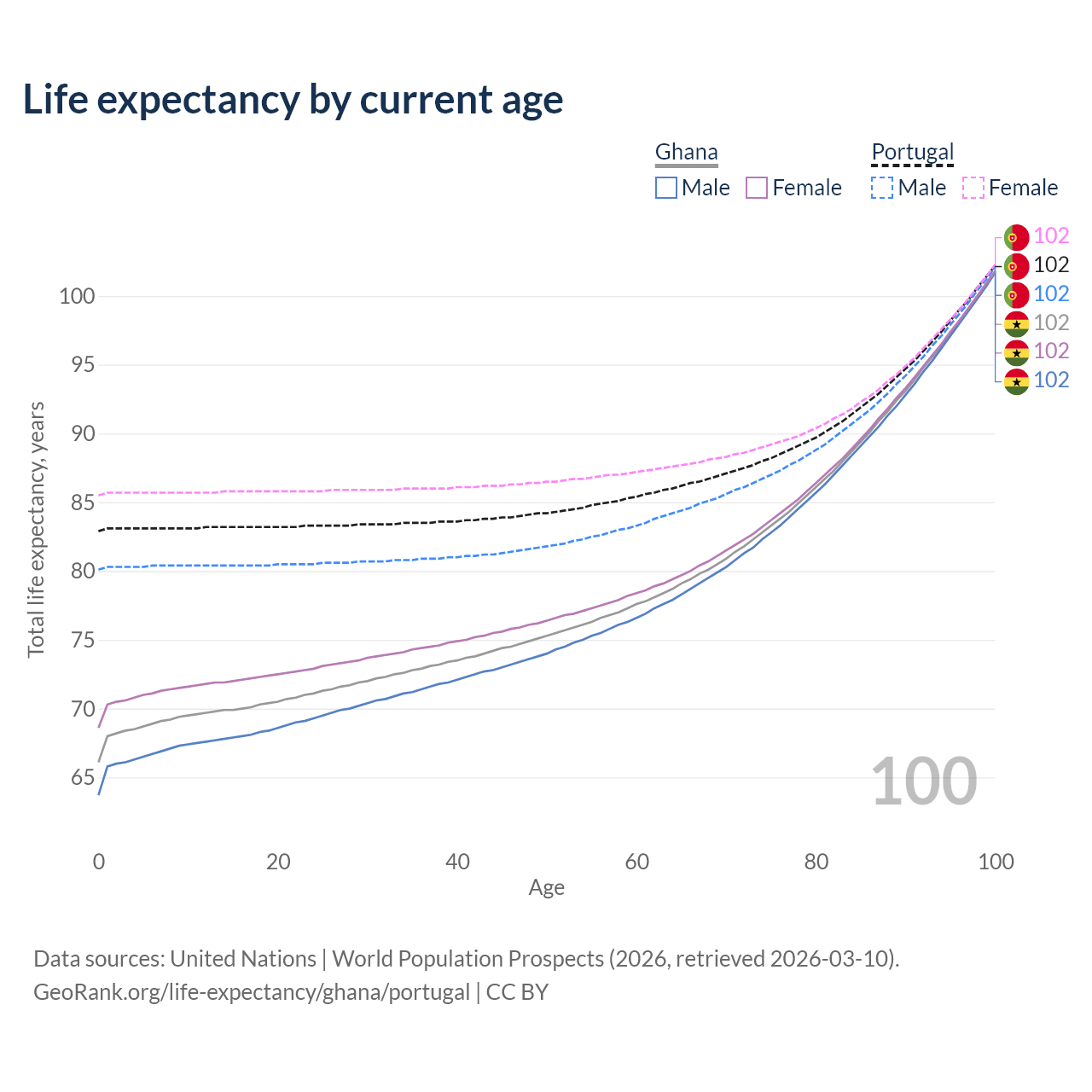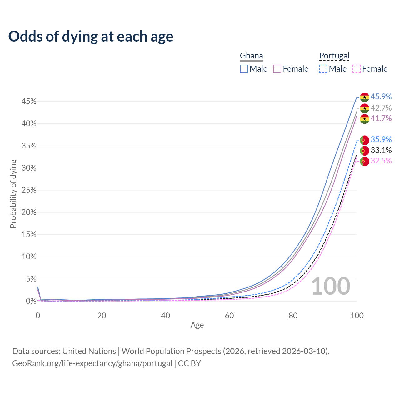 This life expectancy calculator shows the odds of living to 100, 95, 90, and below based on current age for both males and females in Ghana and Portugal, along with mean and median age of death. The calculations are based on the 2026 life tables (actuarial tables) from the UN World Population Prospects.