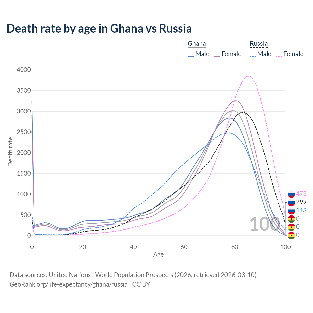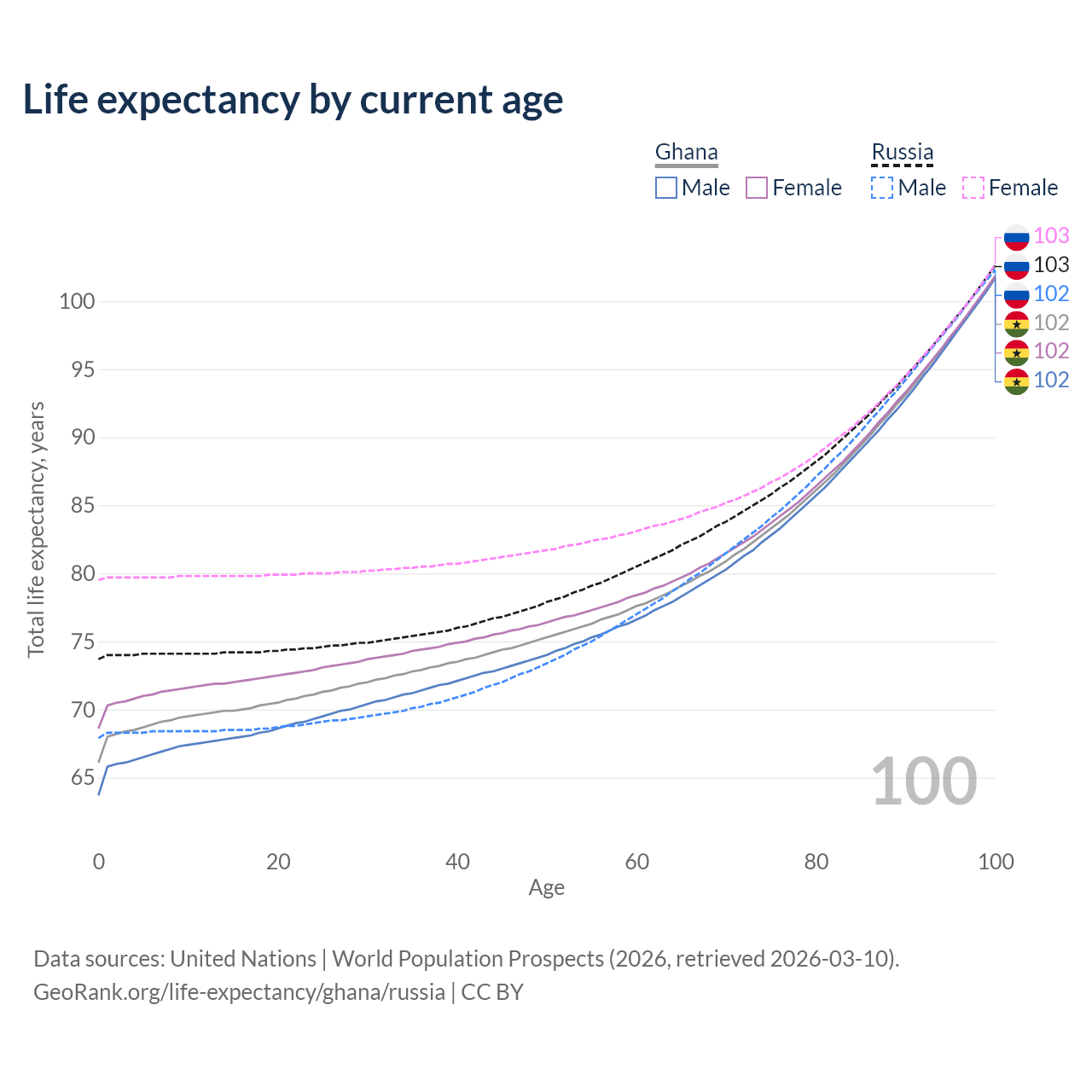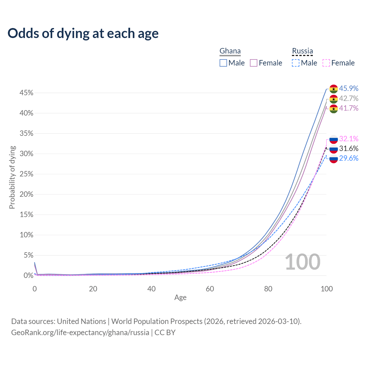 This life expectancy calculator shows the odds of living to 100, 95, 90, and below based on current age for both males and females in Ghana and Russia, along with mean and median age of death. The calculations are based on the 2026 life tables (actuarial tables) from the UN World Population Prospects.
