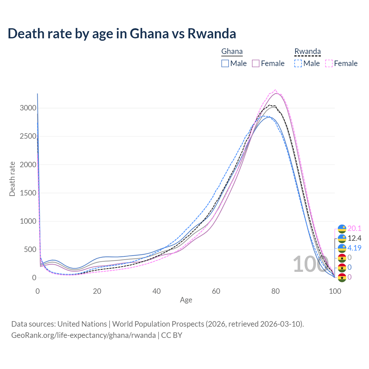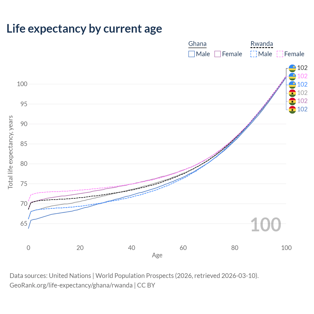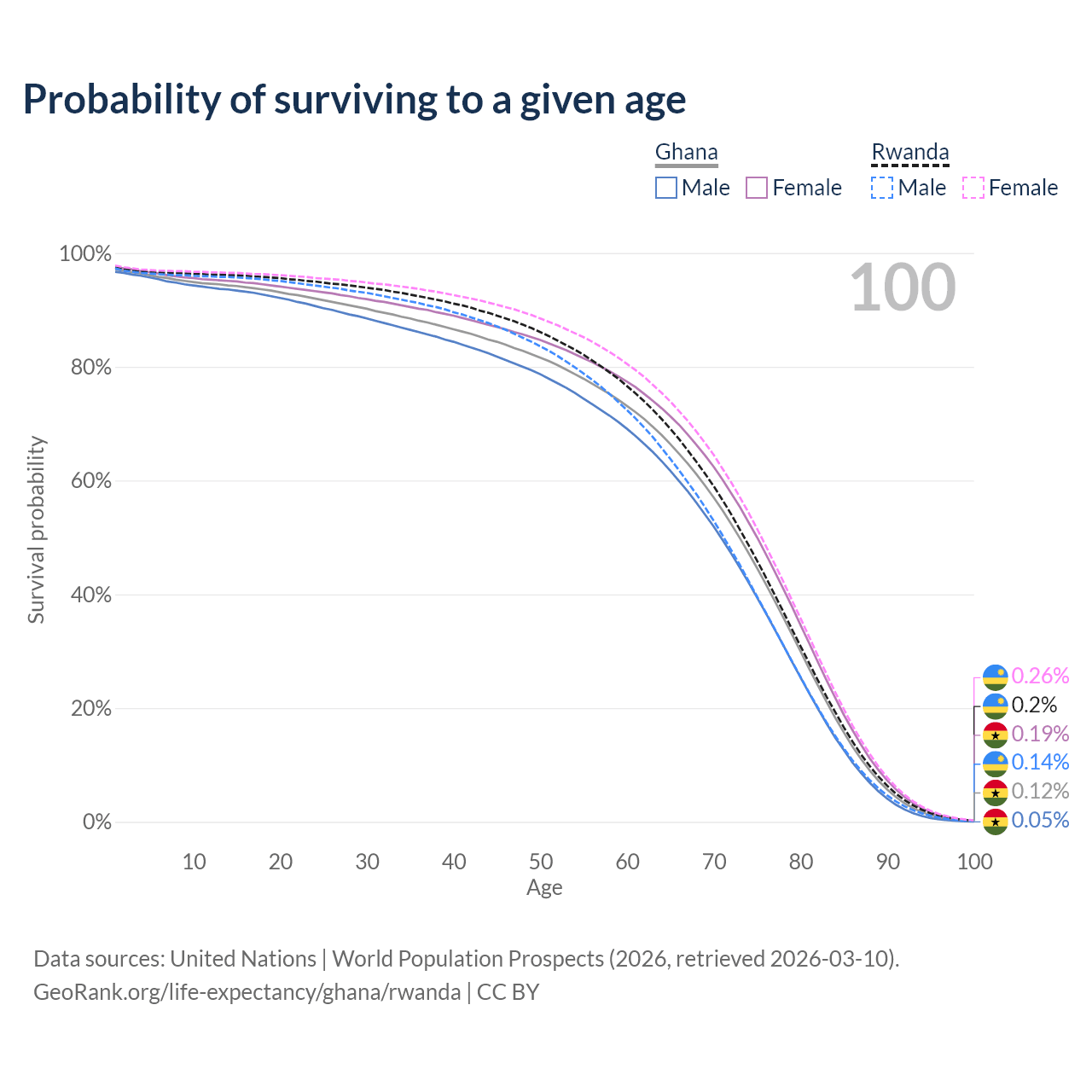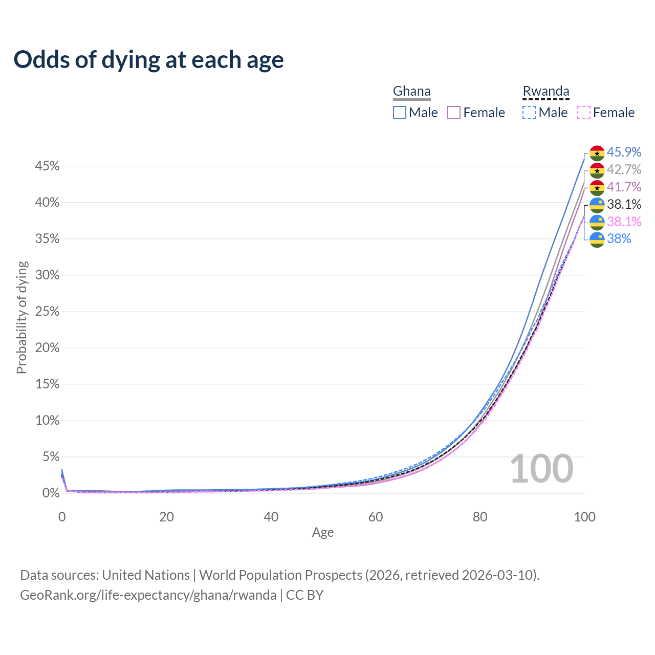 This life expectancy calculator shows the odds of living to 100, 95, 90, and below based on current age for both males and females in Ghana and Rwanda, along with mean and median age of death. The calculations are based on the 2026 life tables (actuarial tables) from the UN World Population Prospects.