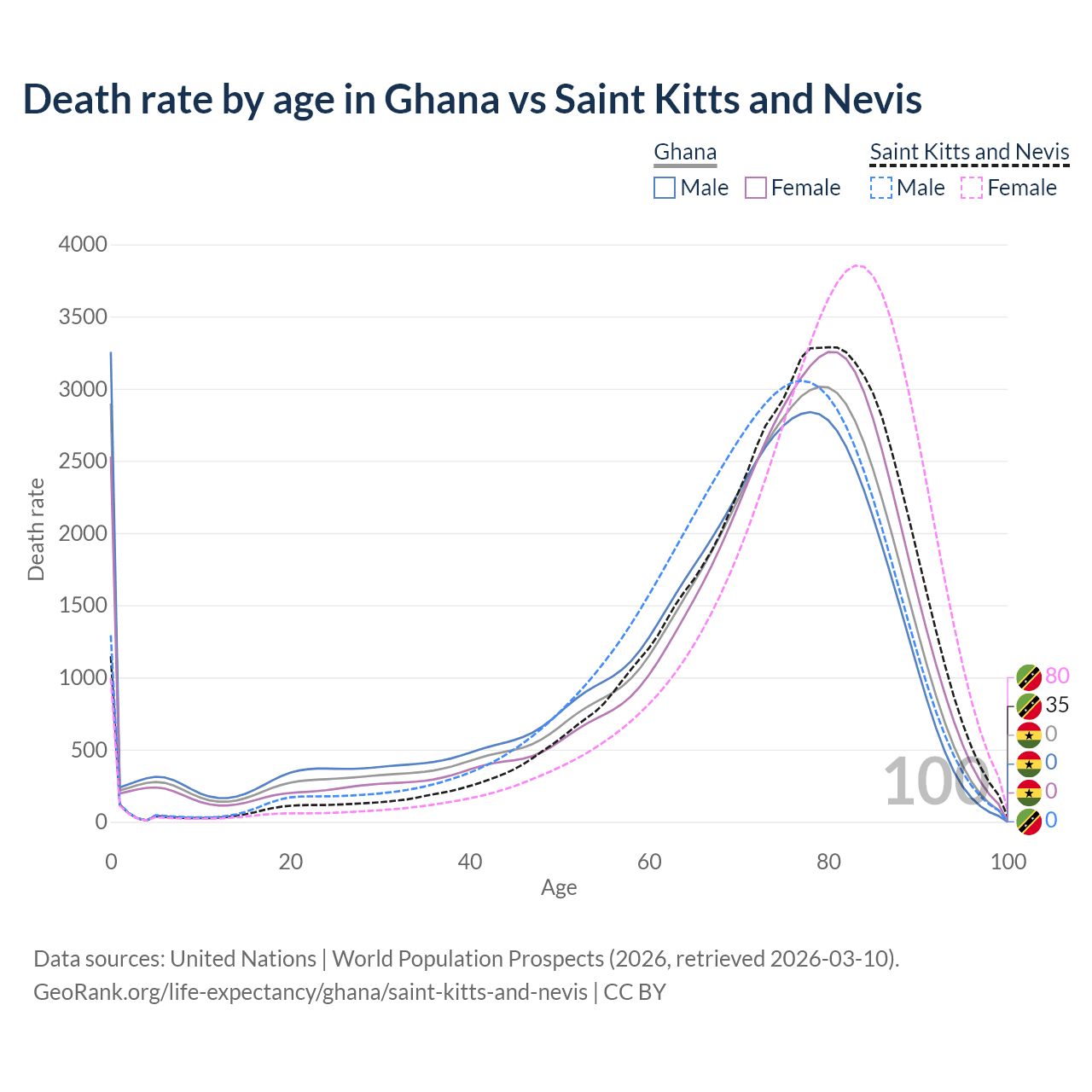This life expectancy calculator shows the odds of living to 100, 95, 90, and below based on current age for both males and females in Ghana and Saint Kitts and Nevis, along with mean and median age of death. The calculations are based on the 2026 life tables (actuarial tables) from the UN World Population Prospects.