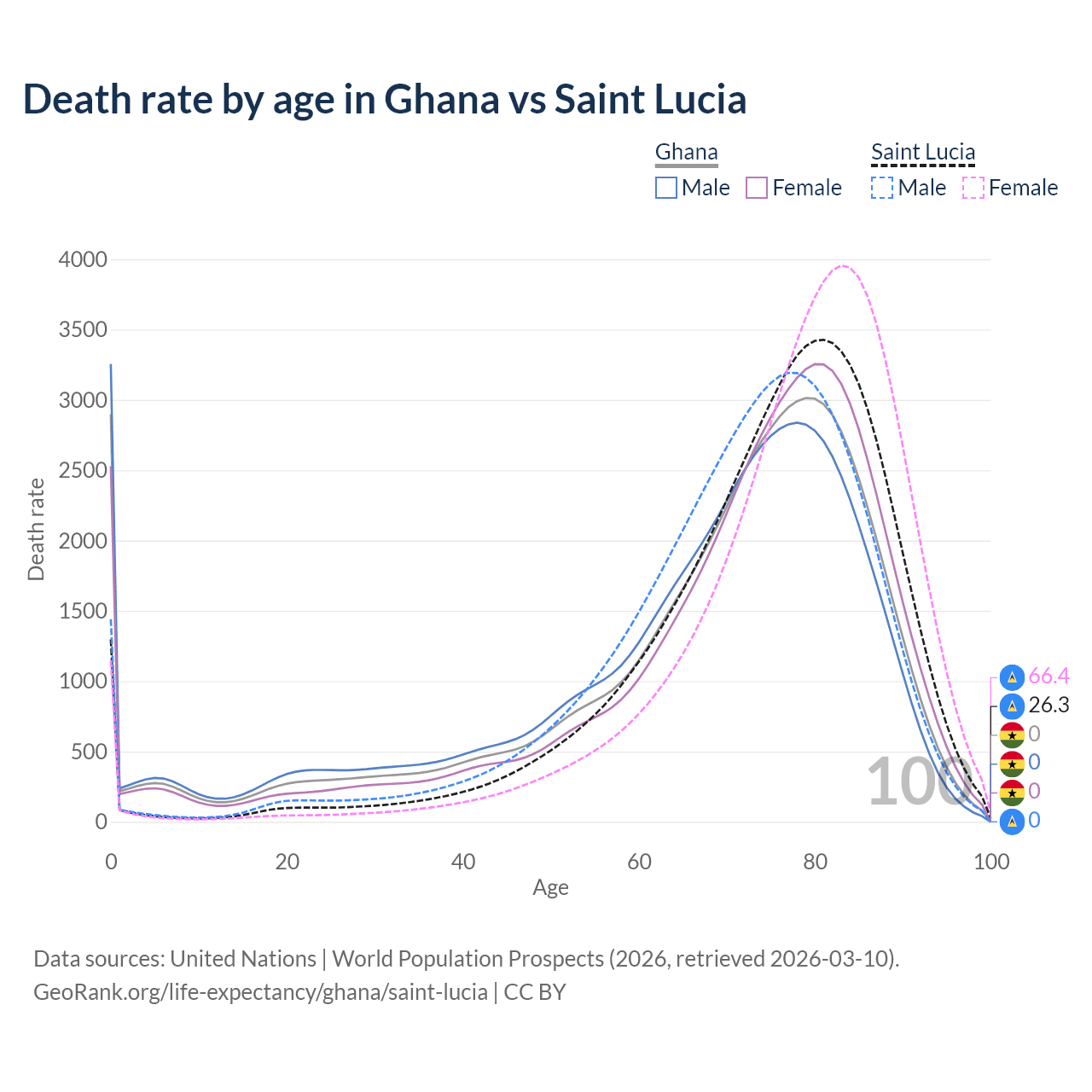 In Ghana, the most common age of death is 79, compared to 81 in Saint Lucia. The median age of death is 73 in Ghana and 76.8 in Saint Lucia, meaning only half of each cohort is expected to live past that age.