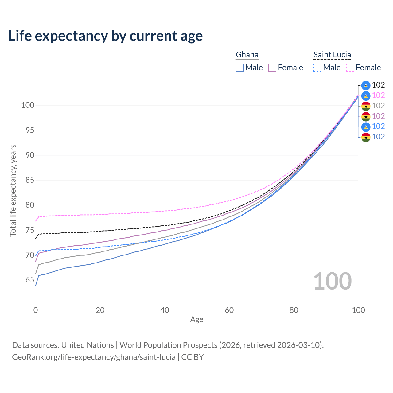 This life expectancy calculator shows the odds of living to 100, 95, 90, and below based on current age for both males and females in Ghana and Saint Lucia, along with mean and median age of death. The calculations are based on the 2026 life tables (actuarial tables) from the UN World Population Prospects.