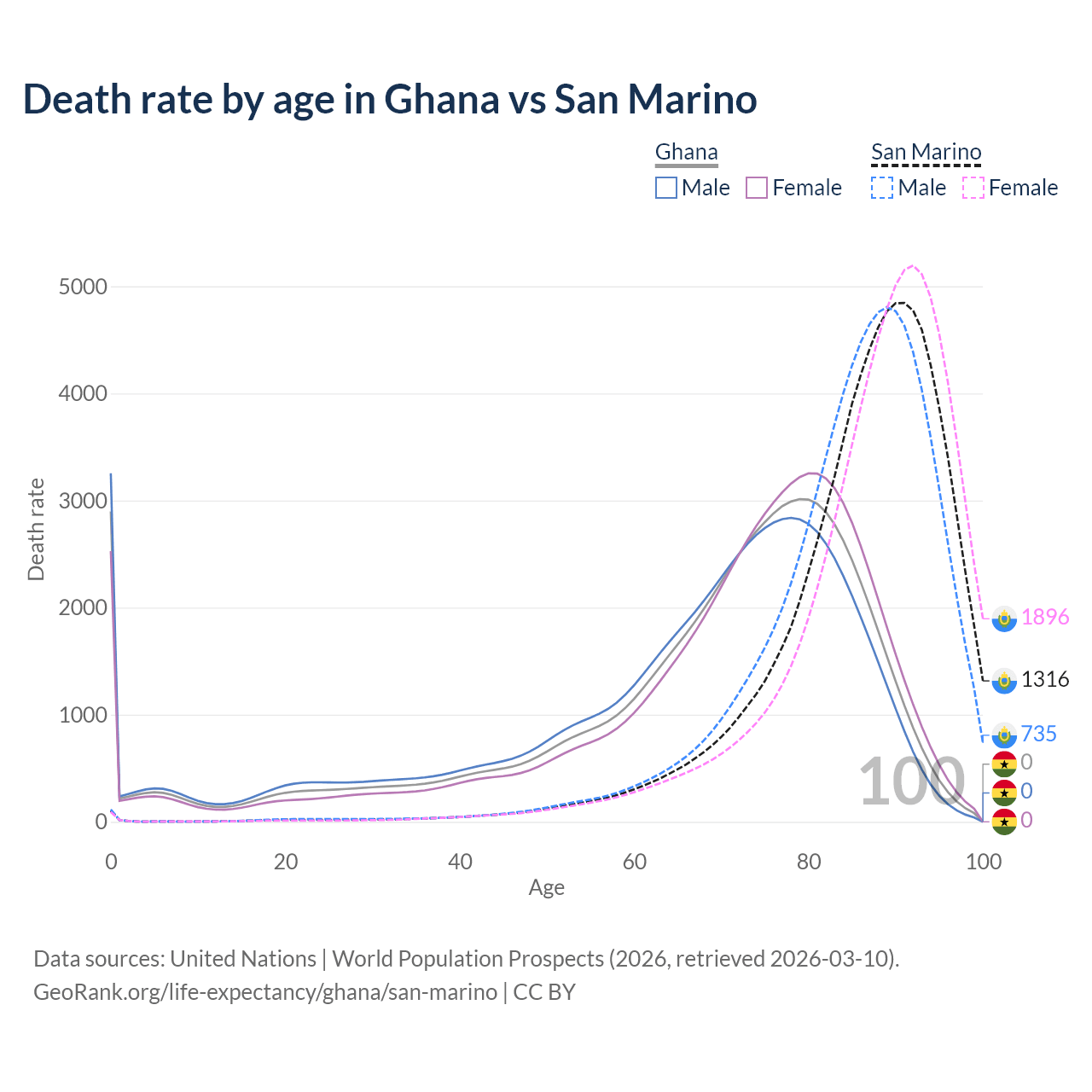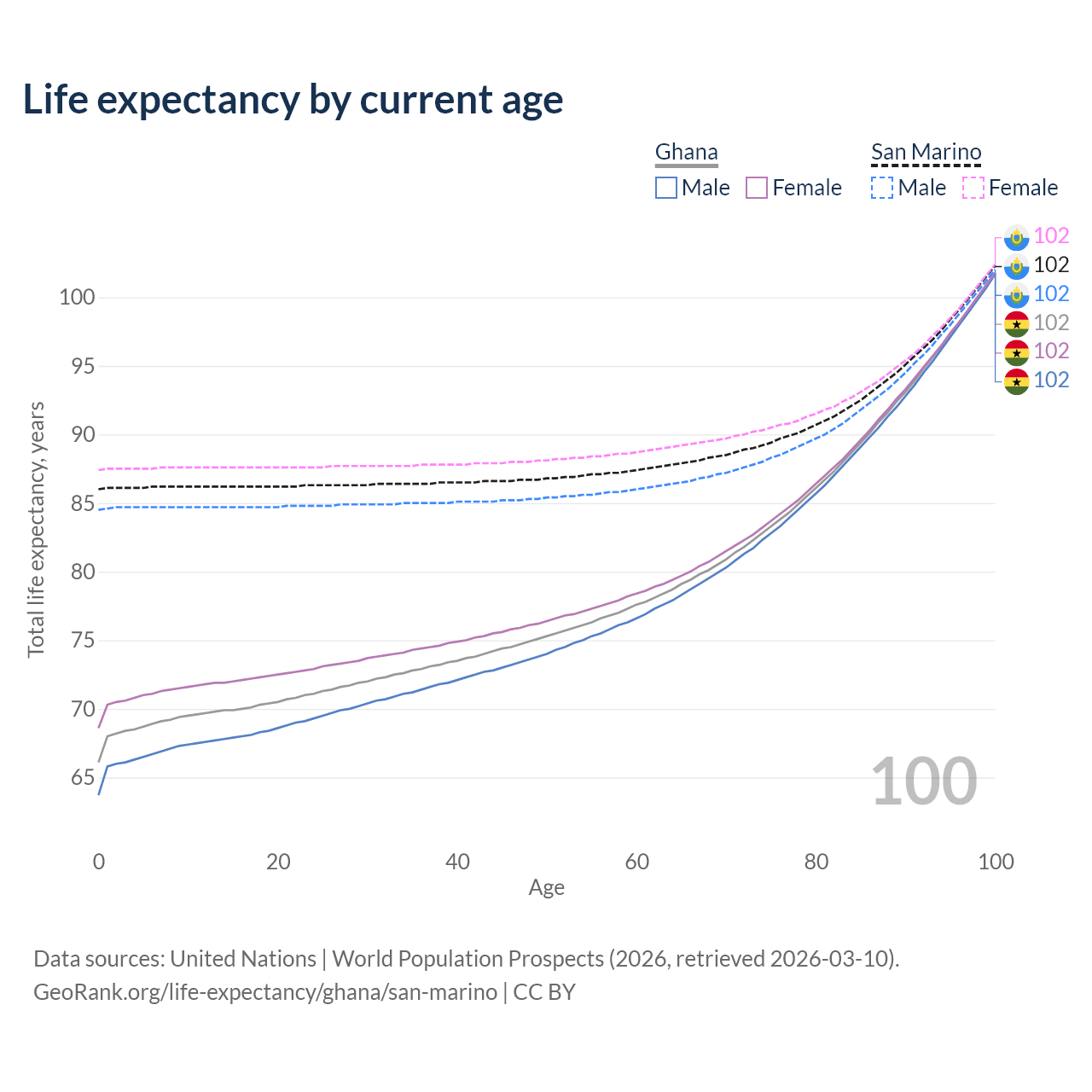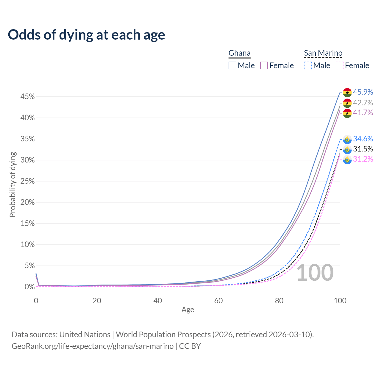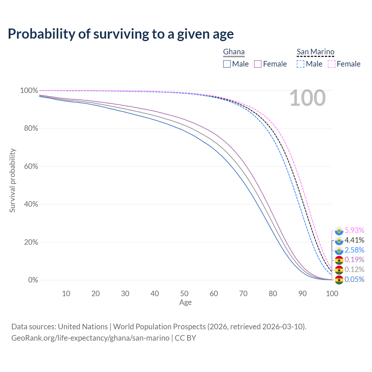 This life expectancy calculator shows the odds of living to 100, 95, 90, and below based on current age for both males and females in Ghana and San Marino, along with mean and median age of death. The calculations are based on the 2026 life tables (actuarial tables) from the UN World Population Prospects.