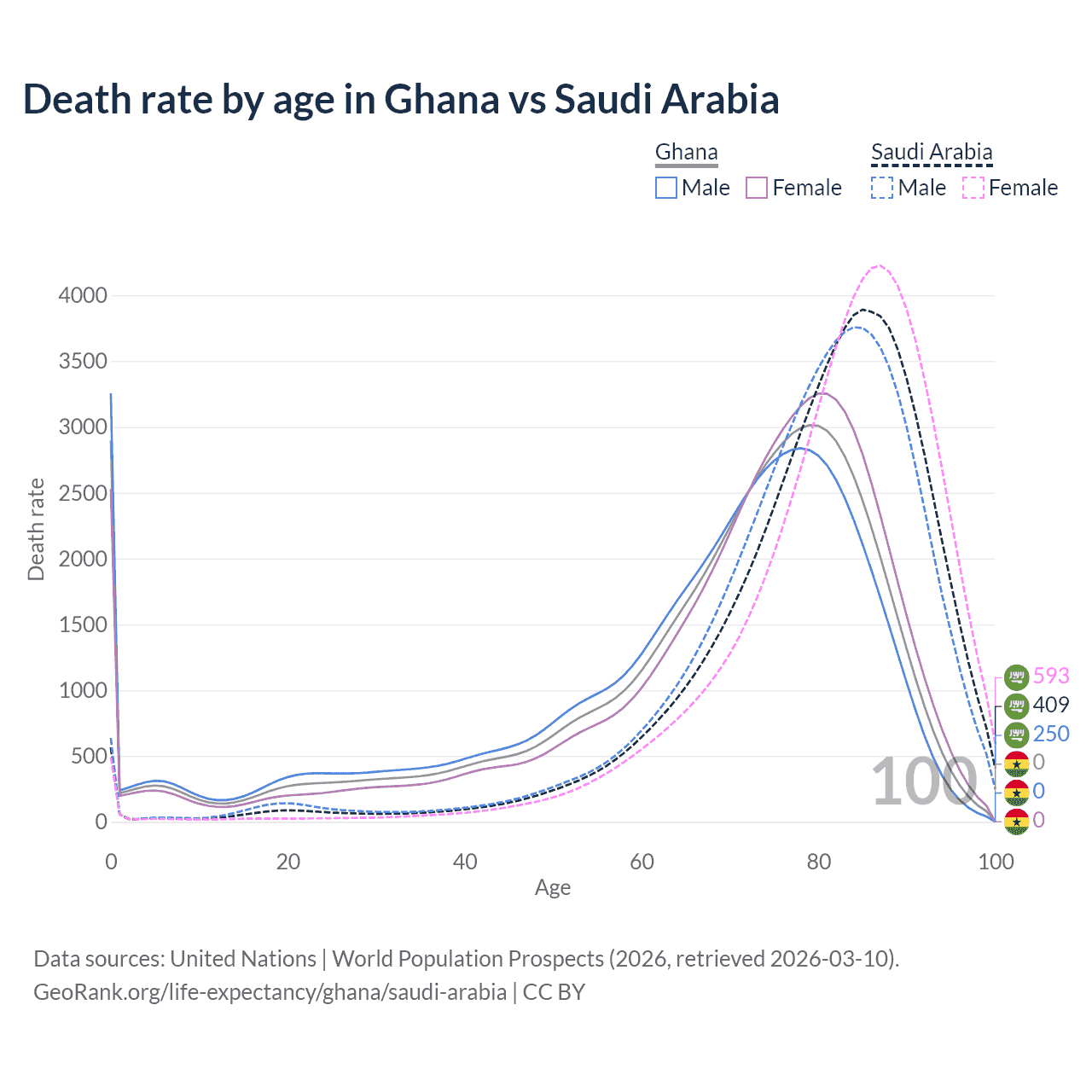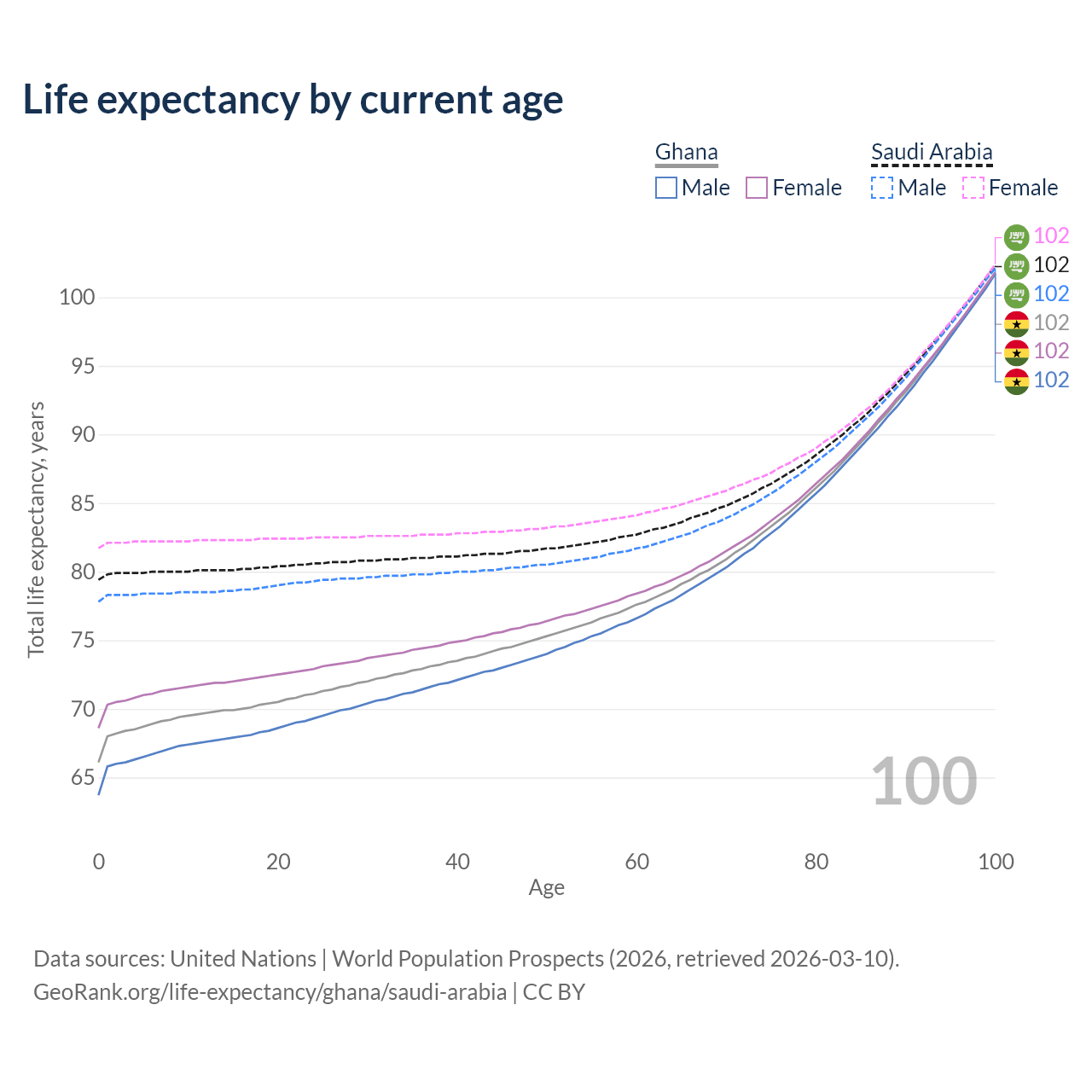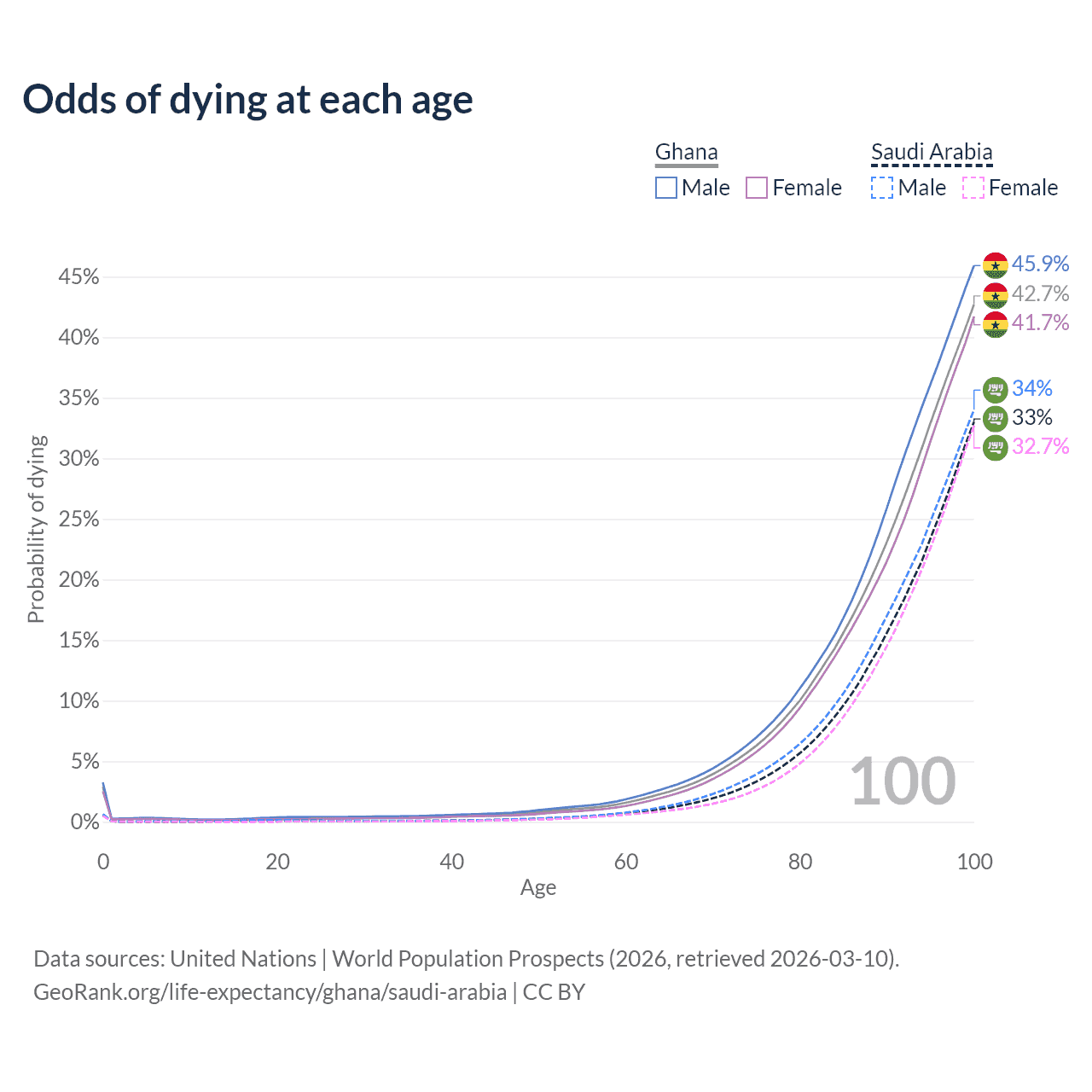This life expectancy calculator shows the odds of living to 100, 95, 90, and below based on current age for both males and females in Ghana and Saudi Arabia, along with mean and median age of death. The calculations are based on the 2026 life tables (actuarial tables) from the UN World Population Prospects.