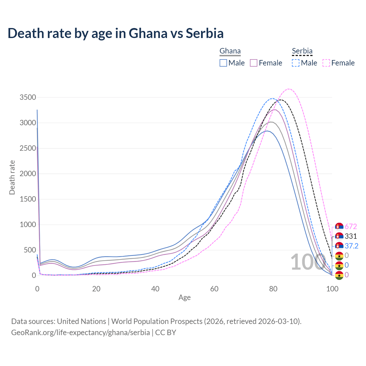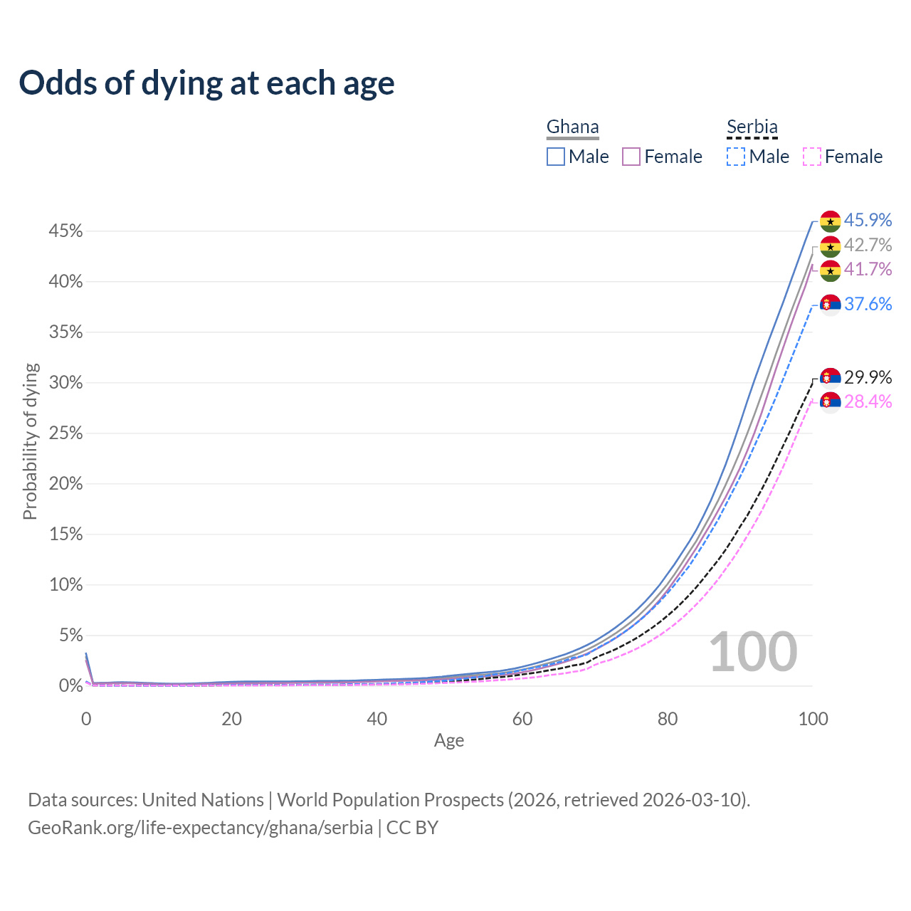 This life expectancy calculator shows the odds of living to 100, 95, 90, and below based on current age for both males and females in Ghana and Serbia, along with mean and median age of death. The calculations are based on the 2026 life tables (actuarial tables) from the UN World Population Prospects.