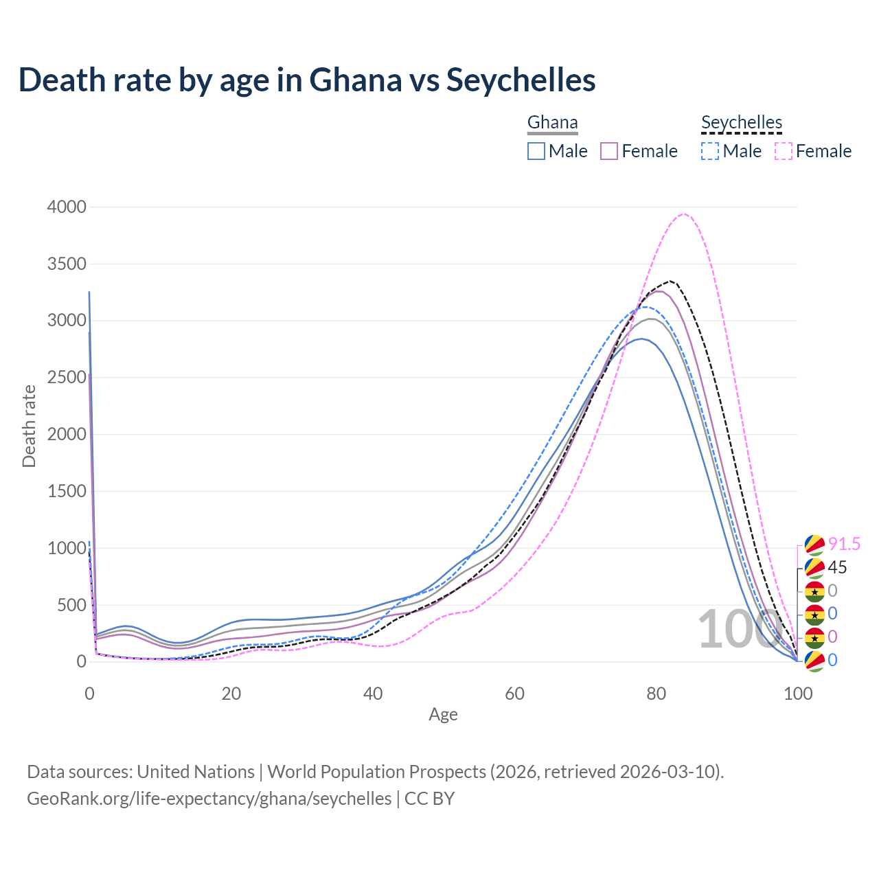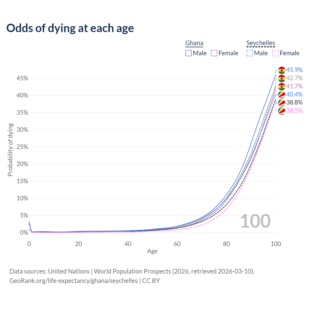 This life expectancy calculator shows the odds of living to 100, 95, 90, and below based on current age for both males and females in Ghana and the Seychelles, along with mean and median age of death. The calculations are based on the 2026 life tables (actuarial tables) from the UN World Population Prospects.
