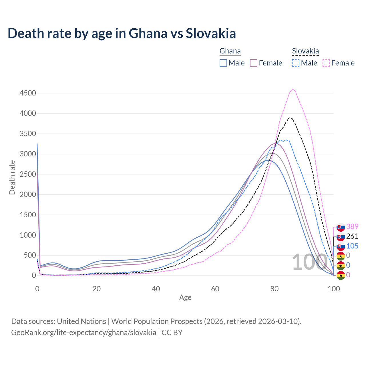 In Ghana, the most common age of death is 79, compared to 85 in Slovakia. The median age of death is 73 in Ghana and 82 in Slovakia, meaning only half of each cohort is expected to live past that age.