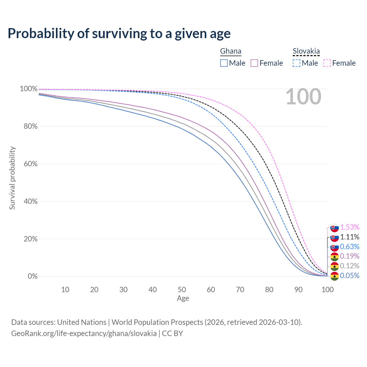 This life expectancy calculator shows the odds of living to 100, 95, 90, and below based on current age for both males and females in Ghana and Slovakia, along with mean and median age of death. The calculations are based on the 2026 life tables (actuarial tables) from the UN World Population Prospects.