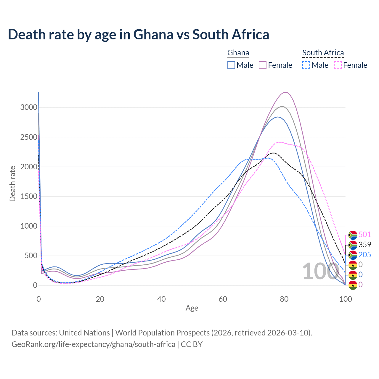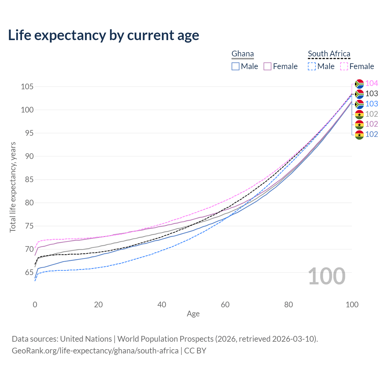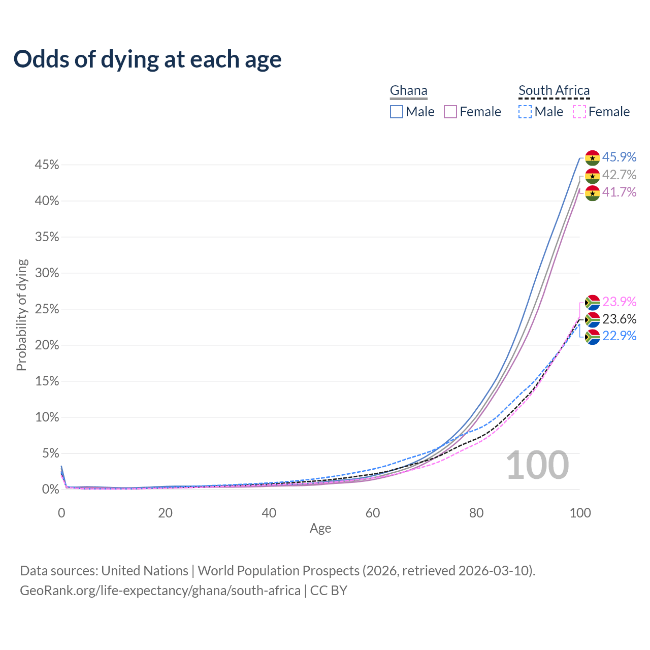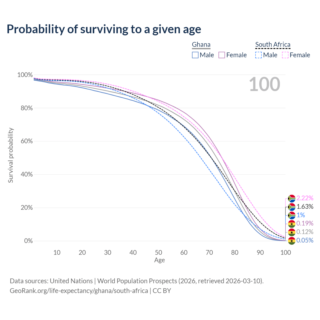This life expectancy calculator shows the odds of living to 100, 95, 90, and below based on current age for both males and females in Ghana and South Africa, along with mean and median age of death. The calculations are based on the 2026 life tables (actuarial tables) from the UN World Population Prospects.