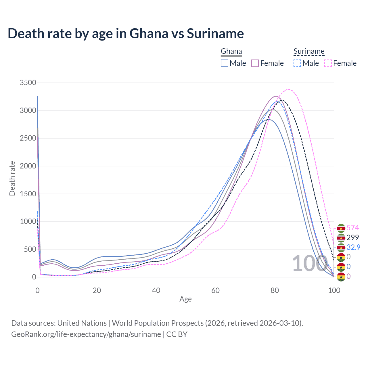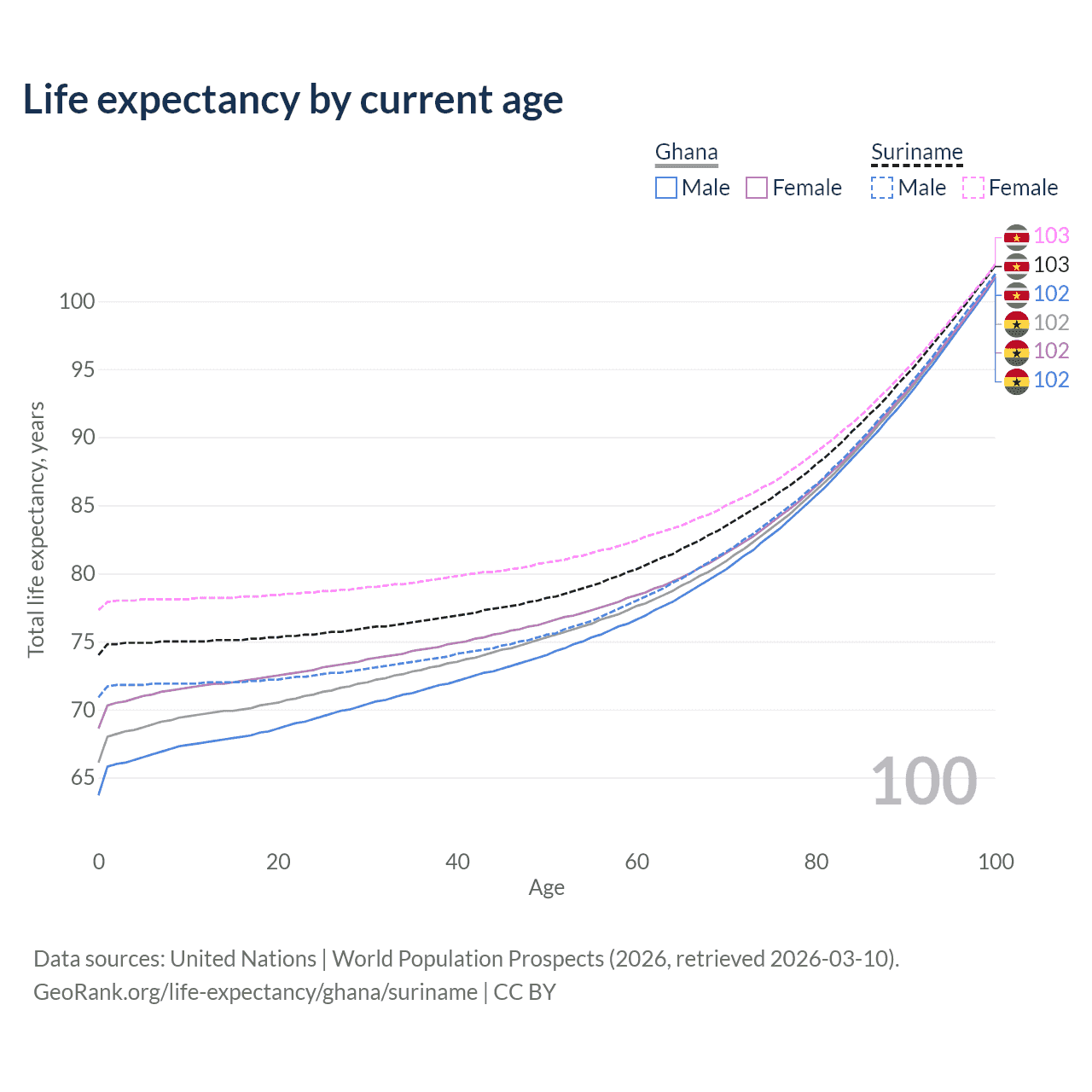 This life expectancy calculator shows the odds of living to 100, 95, 90, and below based on current age for both males and females in Ghana and Suriname, along with mean and median age of death. The calculations are based on the 2026 life tables (actuarial tables) from the UN World Population Prospects.